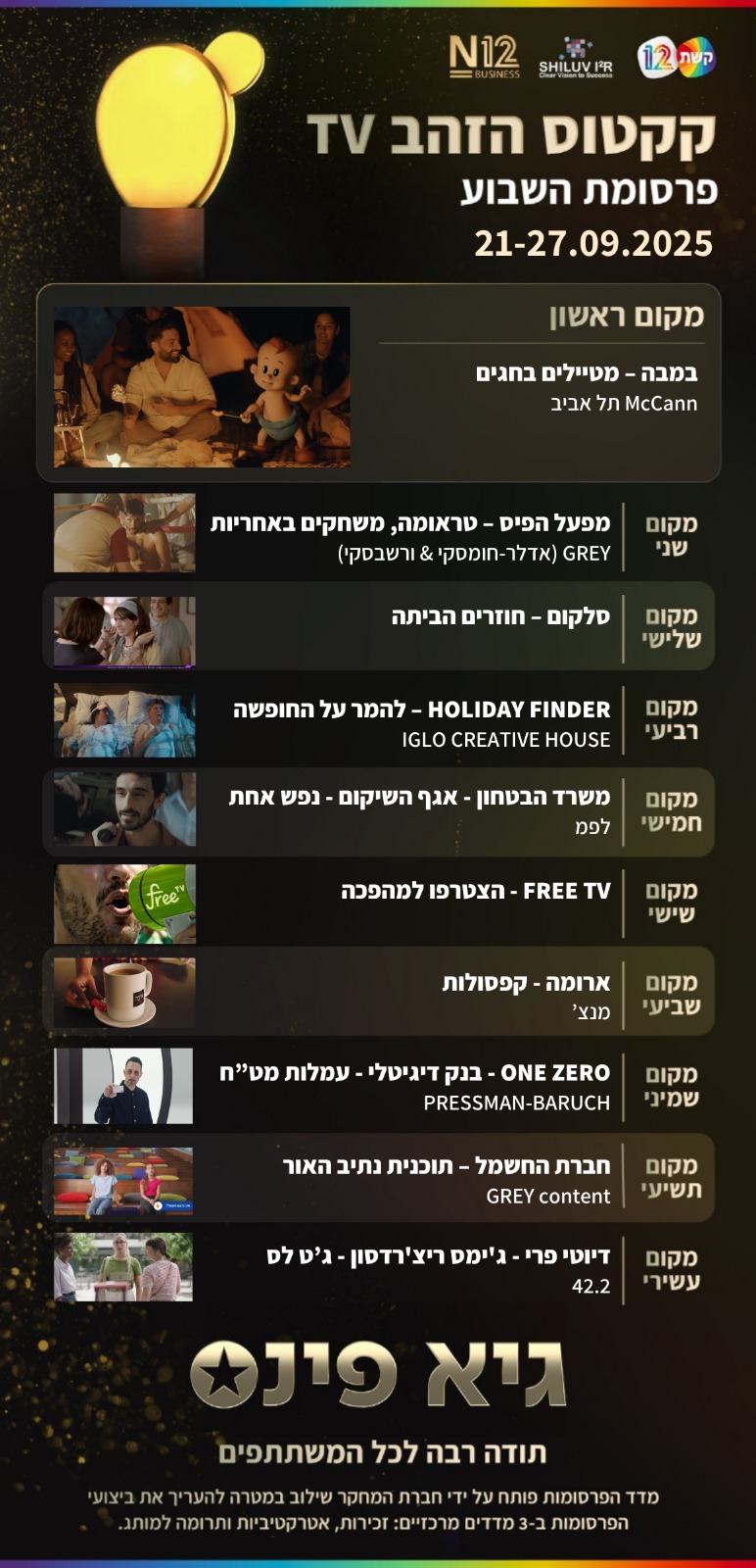 במקום הראשון, התינוק של במבה ואליעד מזכירים לשמור על הארץ נקייה גם בחגים. במקום השני, עידן עמדי מעלה למודעות את נושא ההתמכרויות בקרב אגרוף עוצמתי. וסלקום, במקום השלישי, מרגשת עם חזרה הביתה ואיחולי שנה טובה. אלו הפרסומות שעשו את השבוע