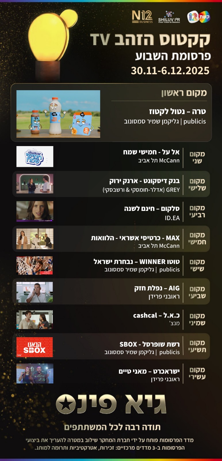 במקום הראשון טרה משיקה סדרת מוצרים ללא לקטוז. במקום השני, עלאל יוצאת במבצע 'חמישי שמח'. ובמקום השלישי, רותם סלע בוחנת את אלישע בנאי בשאלות על בנק דיסקונט. אלו הפרסומות שעשו את השבוע