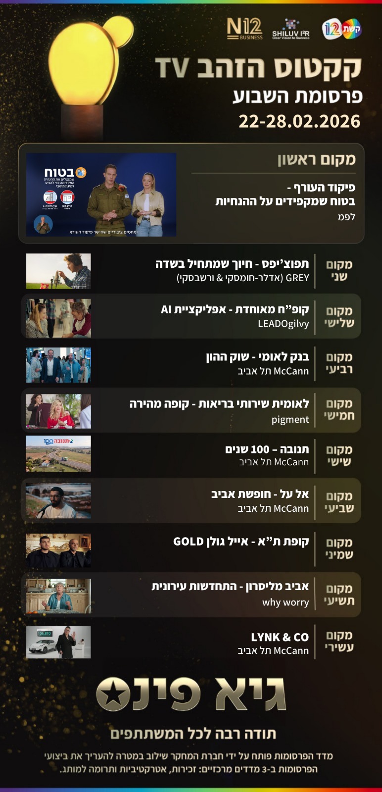 במסגרת המחקר, נבדקות כל שבוע הפרסומות האהובות ביותר בערוצים המסחריים באמצעות סקר מייצג בקרב 640 מרואיינים בני 18+.