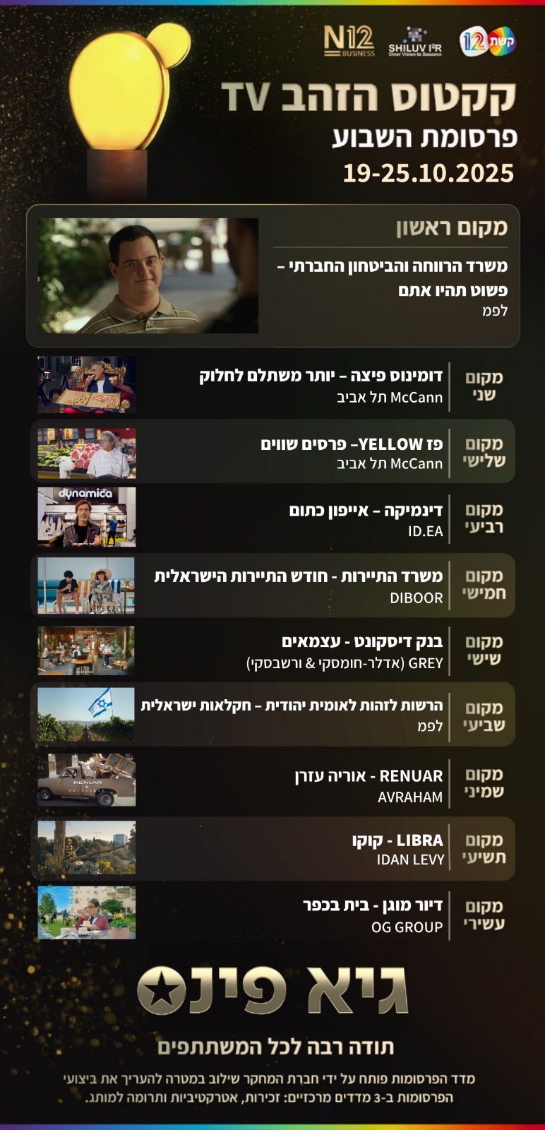 במקום הראשון: משרד הרווחה והביטחון החברתי מוביל יוזמה מרגשת שמחברת אנשים עם מוגבלות לחיים עצמאיים בקהילה. לאחר מכן, דומינוס דואגים שתיהנו מהפיצה בלי ויכוחים על החלוקה. ולבסוף, טיטנסקי רק מנסה לגלות מהם כל הפרסים השווים של YELLOW. אלו הפרסומות שעשו את השבוע