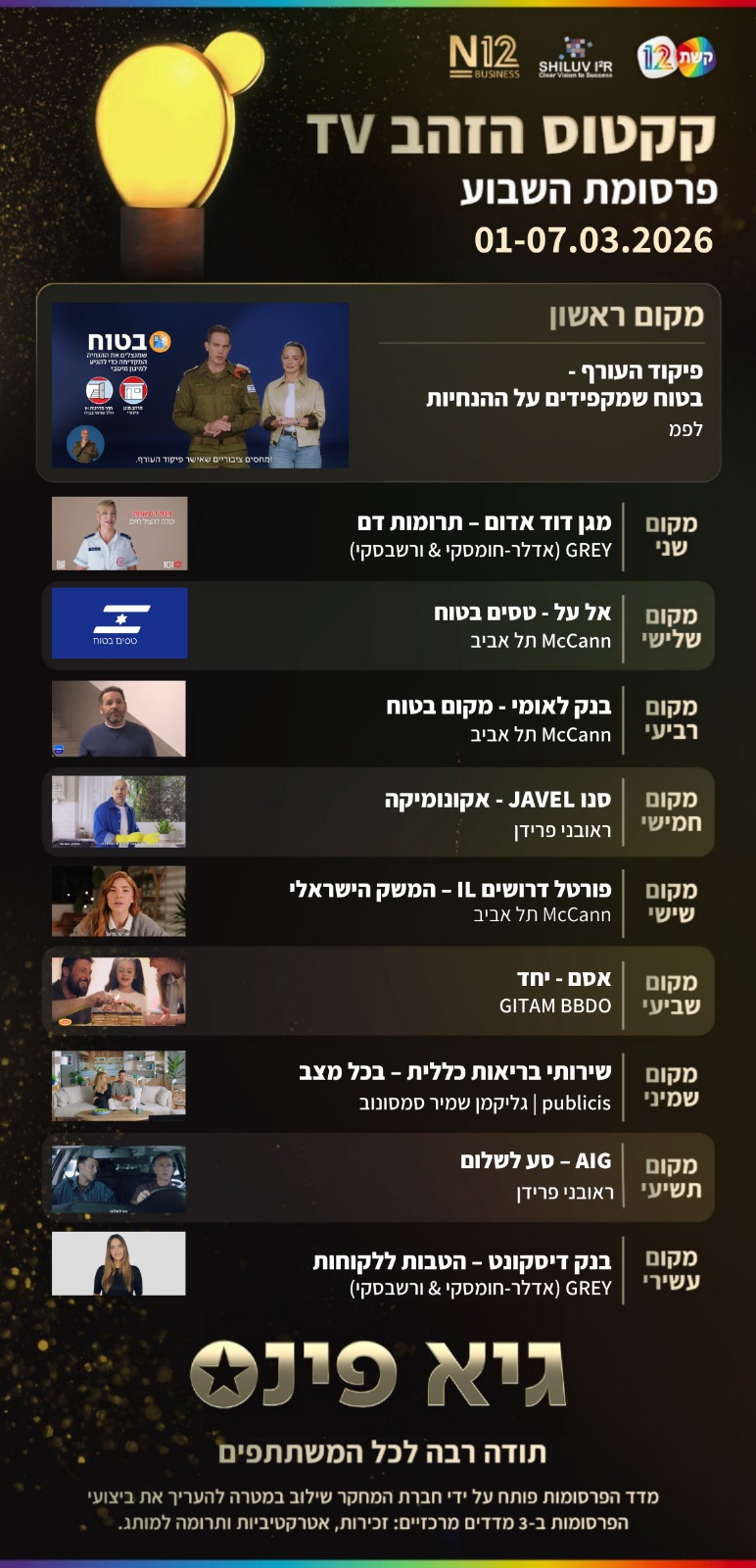 במסגרת המחקר, נבדקות כל שבוע הפרסומות האהובות ביותר בערוצים המסחריים באמצעות סקר מייצג בקרב 640 מרואיינים בני 18+.