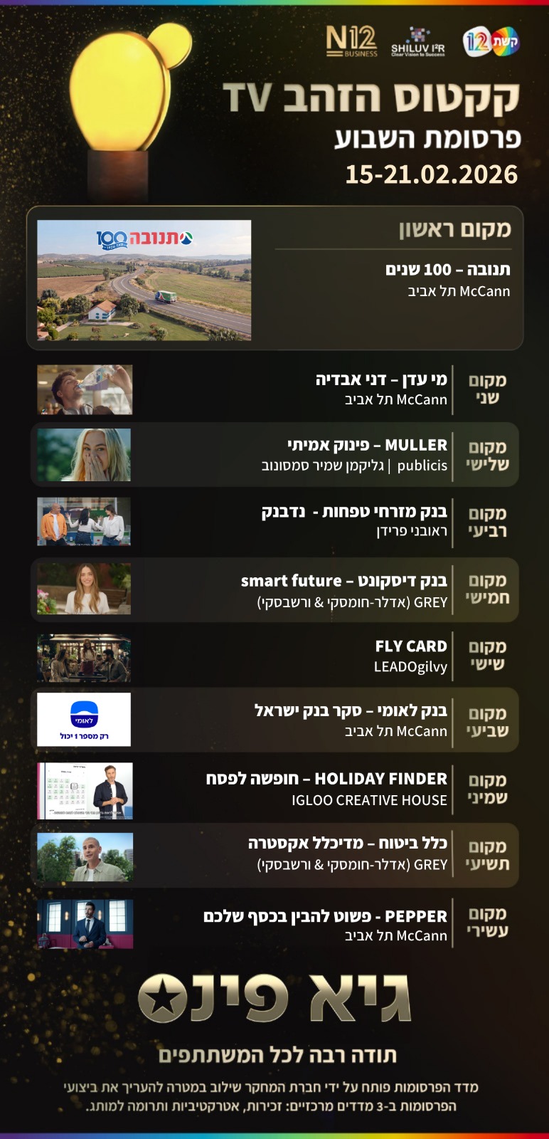 חוזרים אחורה זמן עם המקום הראשון, דני אבדיה מגיע למקום השני והמכובד והמקום השלישי מעולם לא היה מפנק כל כך. אלו הפרסומות שעשו לכם את השבוע
