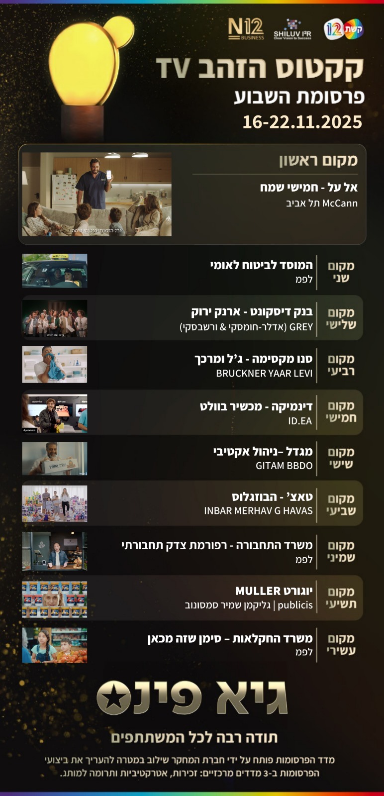 במסגרת המחקר, נבדקות כל שבוע הפרסומות האהובות ביותר בערוצים המסחריים באמצעות סקר מייצג בקרב 640 מרואיינים בגילאי 18+.
