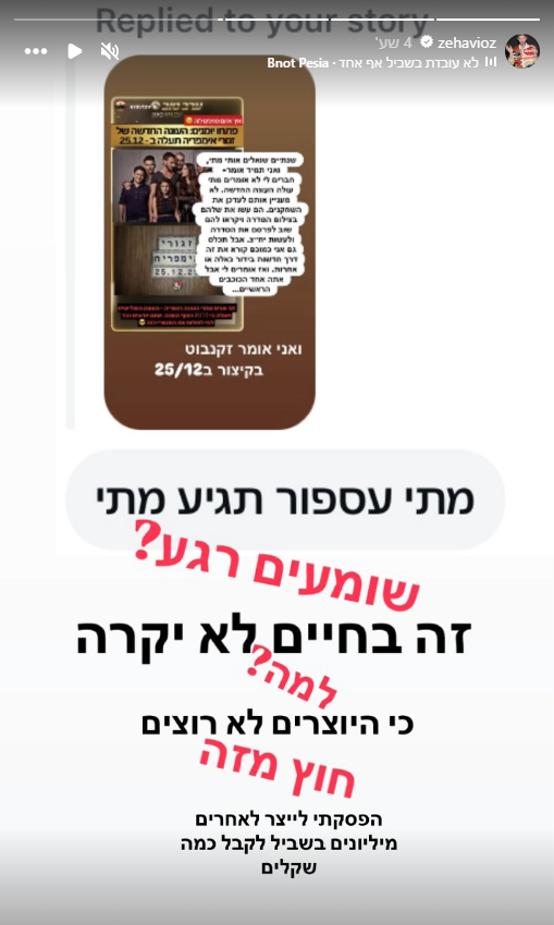 בסטורי נוסף שיתף הודעה ששיגר אחד מעוקביו שבה נשאל "מתי עספור תגיע?". על כך כתב: "שומעים רגע? זה בחיים לא יקרה. למה? כי היוצרים לא רוצים. חוץ מזה, הפסקתי לייצר לאחרים מיליונים בשביל לקבל כמה שקלים".