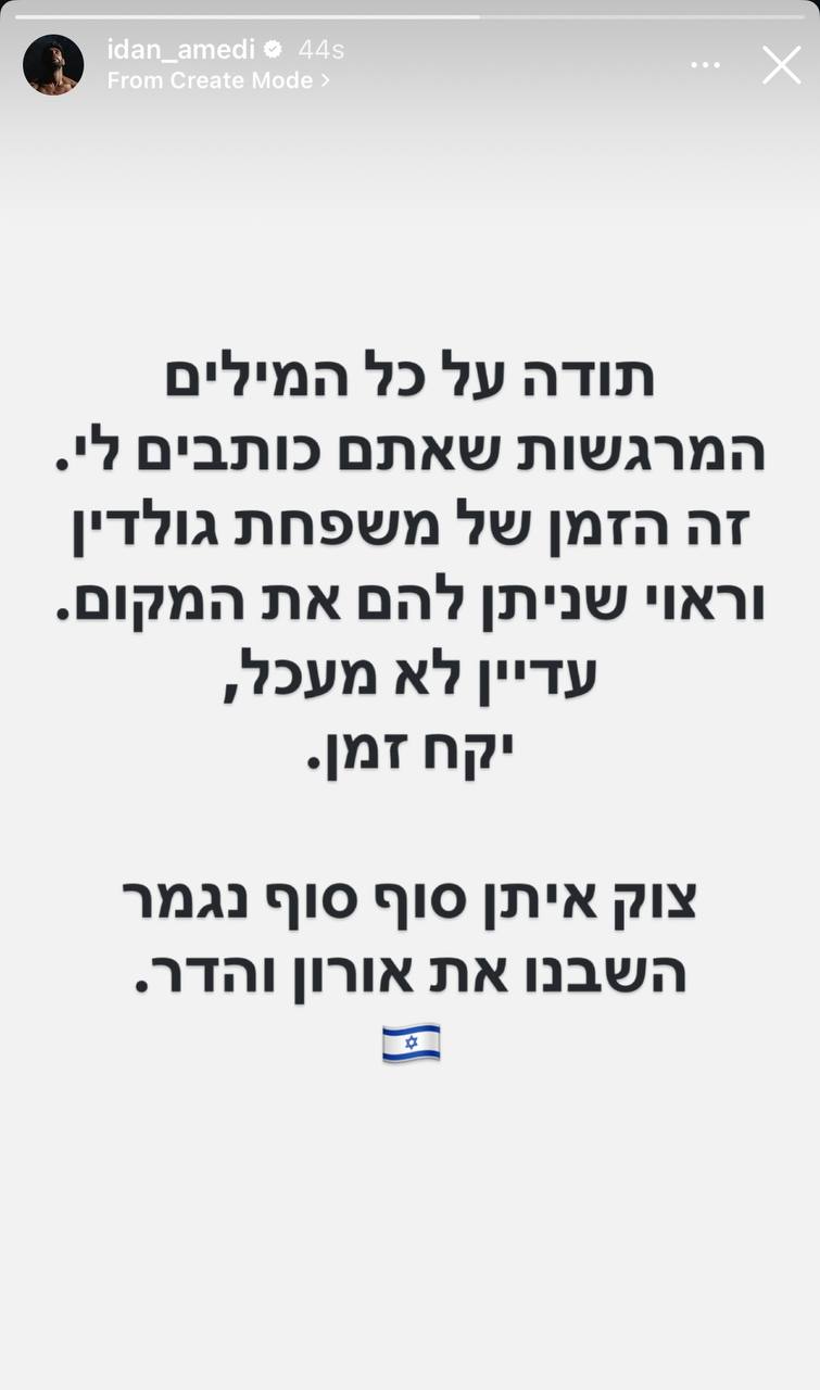 "תודה על כל המילים המרגשות שאתם כותבים לי", כתב בסטורי שפרסם בחשבון האינסטגרם שלו. "זה הזמן של משפחת גולדין וראוי שניתן להם את המקום. אני עדיין לא מעכל, ייקח זמן". הזמר חתם: "צוק איתן סוף-סוף נגמר, השבנו את אורון והדר".