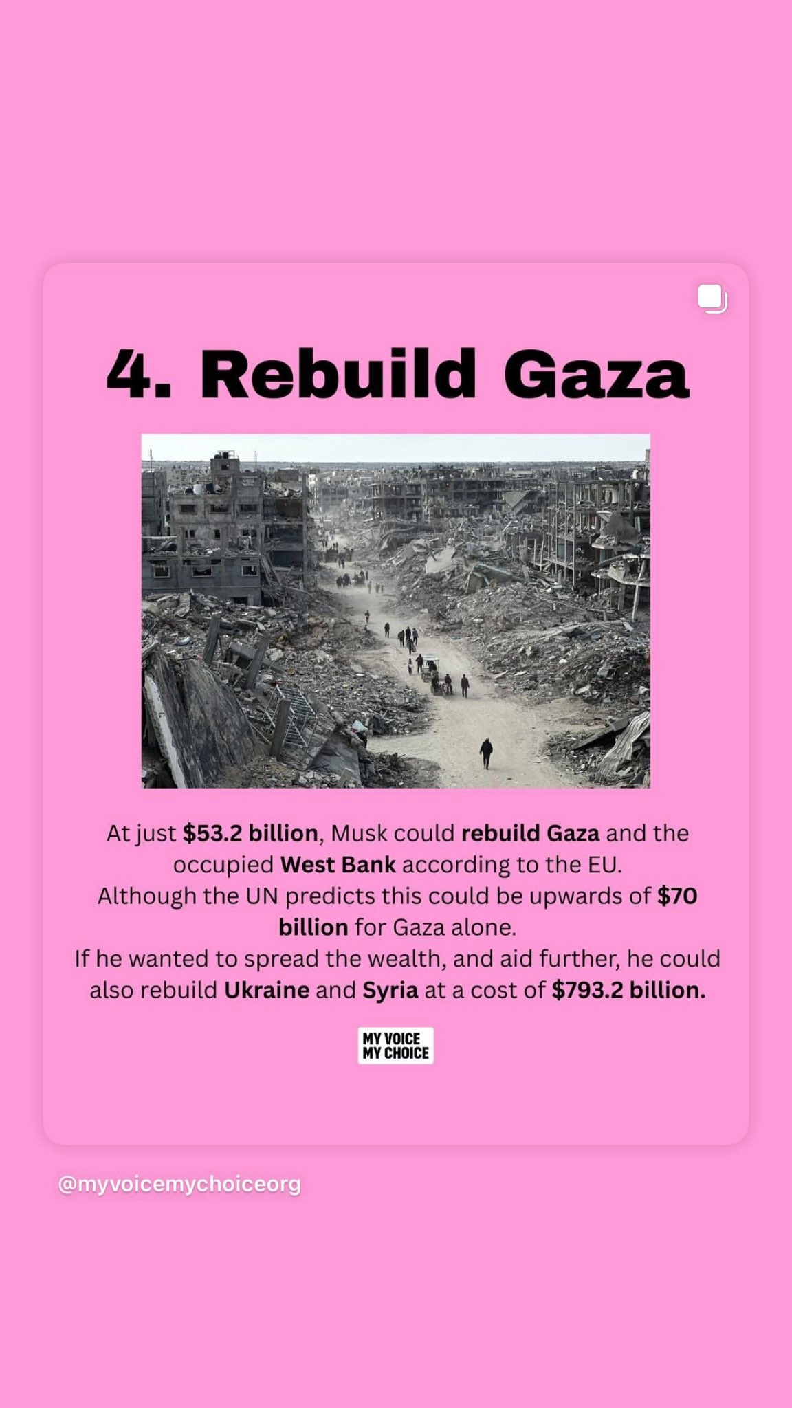 בסדרת סטוריז בחשבון האינסטגרם שלה, הכוכבת בת ה-23 שיתפה מחדש מודעות של ארגון האקטיבסטי My Voice, My Choice שבחן את הדרכים שבהן מאסק יכול להשתמש בכספו למטרות טובות. הארגון טוען שאילו מאסק ישקיע מהונו הוא יוכל לשים קץ לרעב העולמי עד 2030, להציל מינים בסכנת הכחדה ואף "לבנות מחדש את עזה".