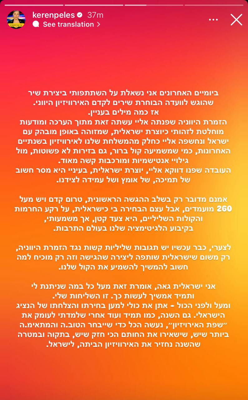"לצערי, כבר עכשיו יש תגובות שליליות קשות נגד הזמרת היוונייה רק משום שישראלית שותפה ליצירה שהגישה וזה רק מוכיח למה חשוב להשמיע את הקול שלנו", הוסיפה. "אני ישראלית גאה, אומרת זאת מעל כל במה שניתנת לי ותמיד אמשיך לעשות כך. זו השליחות שלי. ומעל ולפני הכל - אתן את כולי למען בחירתו והצלחתו של הנציג הישראלי. גם השנה, כמו תמיד ועוד אחרי שלמדתי לעומק את 'שפת האירוויזיון', נעשה הכל כדי שייבחר הטוב.ה והמתאימ.ה ביותר שיש, שישאירו את החותם הכי חזק שיש, בתקווה ובמטרה שהשנה נחזיר את האירוויזיון הביתה, לישראל".