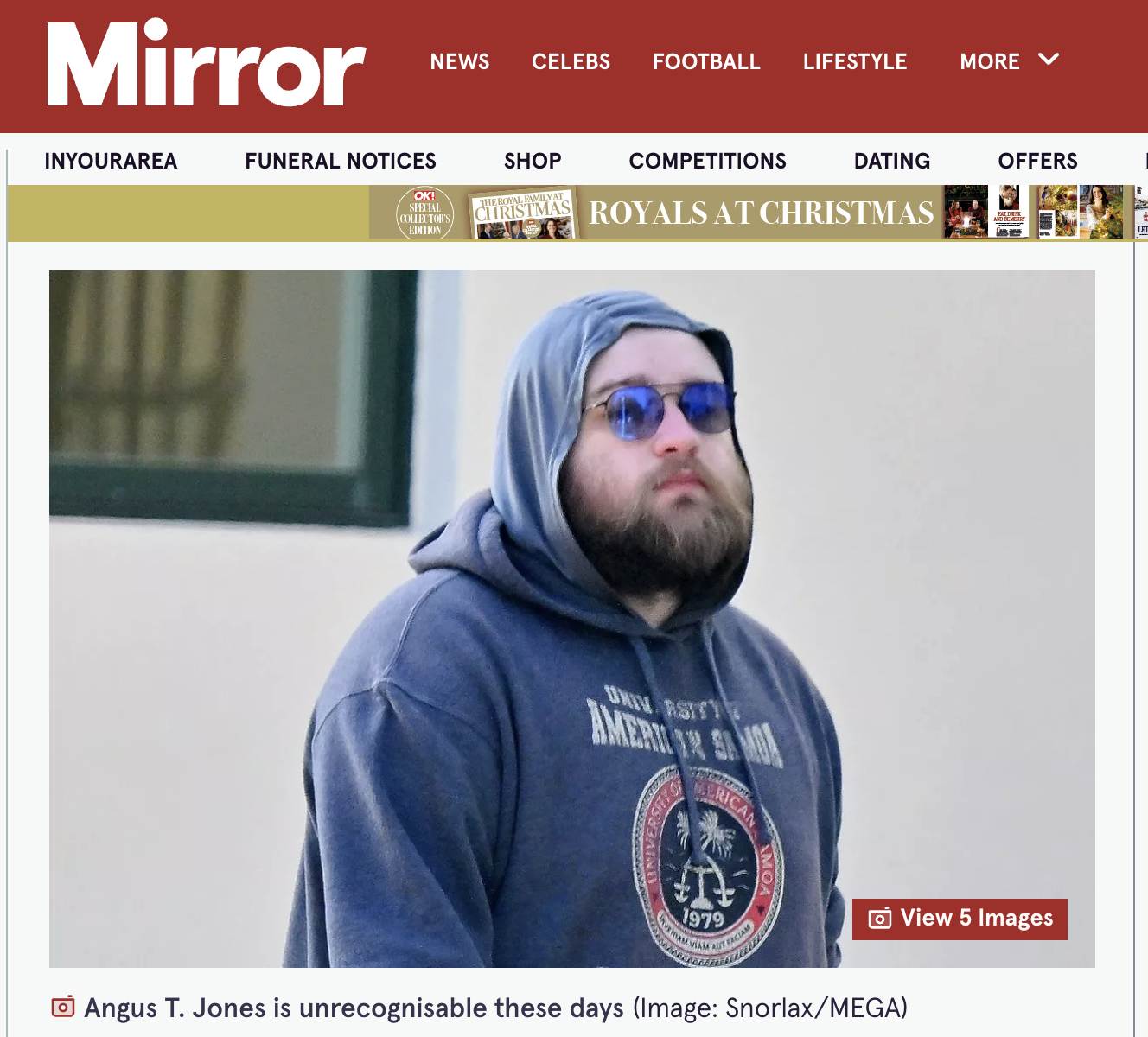 10 שנים אחרי שהסיטקום המצליח "שני גברים וחצי" ירדה מהמסך, אנגוס ט. ג'ונס, כוכב הסדרה, מתפרסם ב-Mirror הבריטי תיעוד של השחקן שבו הוא נראה בלתי מזוהה והכי רחוק מדימוי של כוכב הוליוודי.