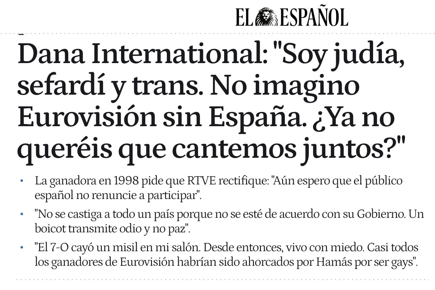 בריאיון לאחד מכלי התקשורת הפופולריים והנקראים בספרד קראה אינטרנשיונל לספרדים לשנות את ההחלטה לפרוש בגלל ישראל - ולהשתתף באירוויזיון בכל זאת • "אירופה רוצה את ספרד באירוויזיון - וגם אני", אמרה • כשנשאלה מה דעתה על ממשלת נתניהו השיבה: "יש לי ביקורת, אבל לא אשתף אותה בעיתון ספרדי. את הביקורת אני משמיעה בשפה שלי" • דנה חשפה לראשונה כי טיל פגע בביתה במהלך המלחמה