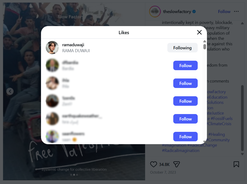 לפי דיווח שפורסם אתמול (שישי) באתר Jewish Insider, אחד הפוסטים שסימנה להם לייק עלה ביום המתקפה בחשבון האינסטגרם של ארגון ללא מטרות רווח בשם The Slow Factory, המציג דחפור שפורץ את הגדר בין ישראל לעזה. הכיתוב שנלווה לפוסט היה "שוברים את חומות האפרטהייד והכיבוש הצבאי", לצד תאריך המתקפה. בדוגמה נוספת, דוואג'י סימנה לייק לפוסט שבו נראו עזתים צוהלים על מה שנראה כמו כלי רכב צבאי ישראלי, כשעליו הכיתוב "שחררו את פלסטין". אותו דיווח כלל פוסטים נוספים שהביעה בהם תמיכה, ובהם תוארה ההתנגדות הפלסטינית כמעשה של הגנה עצמית וכזכויות אדם עבור אנשים החיים תחת כיבוש.