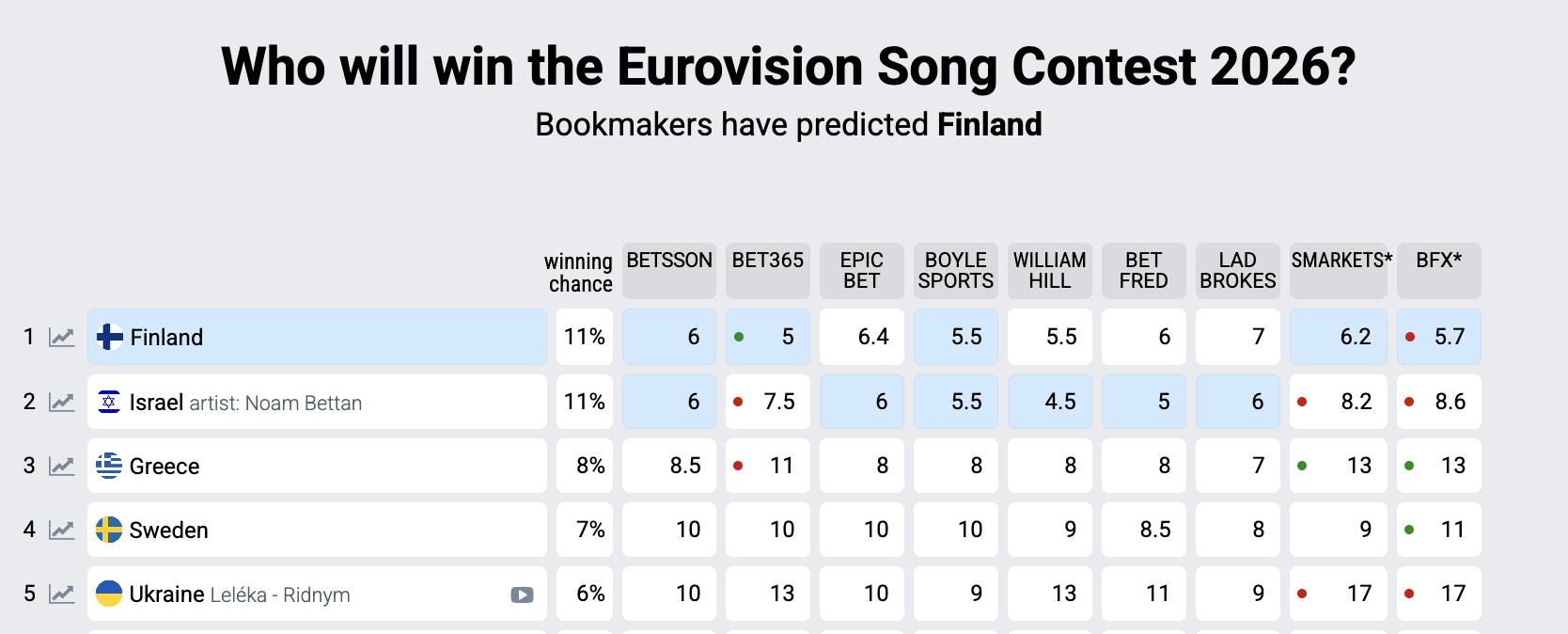 אחרי פינלנד וישראל ניצבות יוון, שוודיה ואוקראינה - היחידה מבין המדורגות בחמישייה הפותחת שכבר שחררה את השיר שאיתה תעלה על הבמה הגדולה באירופה. יש לציין כי רוב המדינות בחרו לא נציגים ולא שיר, כך שעוד מוקדם מאוד לנבא את סיכויי הזכייה. מיקומה של ישראל בראש הטבלה מצביע בעיקר על עניין סביב השתתפותה בתחרות ושיח ער של מעריצי ומעריצות האירוויזיון, כמו גם הסתמכות על תוצאות התחרות בשנים הקודמות.