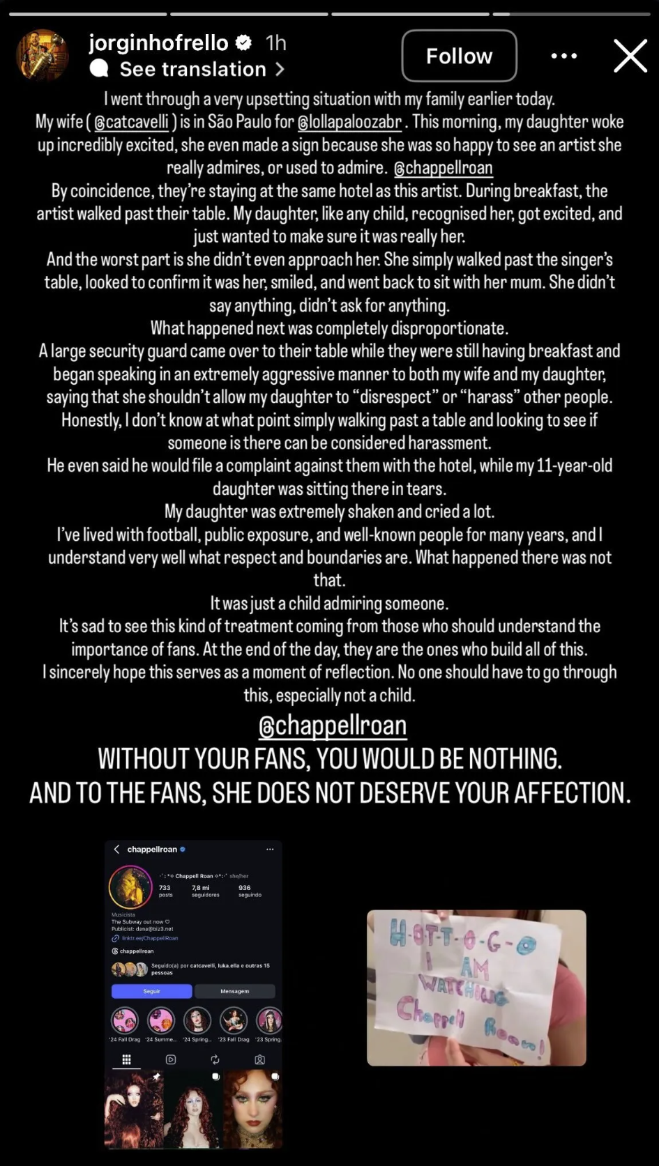 רואן הופיעה הלילה בפסטיבל המוזיקה הנודד "לולה פלוזה" שמתקיים בימים אלה בבברזיל. פרלו, המשחק בקבוצת פלמנגו, תיאר בסטורי בחשבון האינסטגרם שלו "סיטואציה עצובה מאוד" שהתרחשה לדבריו בעת שאשתו ובתו שהו באותו מלון שבו התארחה רואן. "הבת שלי התעוררה נרגשת מאוד", כתב ז'ורז'יניו, או בשמו המלא ז'ורז' לואיש פרלו פיליו, שציין כי היא הכינה שלט לזמרת שהיא "מאוד מעריצה". לטענתו, בתו הבחינה ברואן במהלך ארוחת הבוקר, אך לא ניגשה אליה: "היא רק עברה ליד השולחן של הזמרת, הסתכלה כדי לוודא שזו היא, חייכה וחזרה לשולחן עם אמא שלה. היא לא אמרה כלום, לא ביקשה כלום".