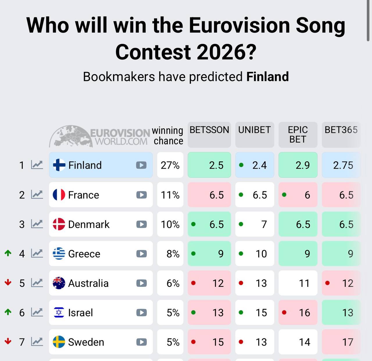 הסערה הפוליטית סביב אירוויזיון 2026 מסרבת להירגע, אבל התשובה לכך מגיעה דווקא בטבלת ההימורים: למרות המתקפה של פליסיה, הנציגה השוודית נגד השתתפות באירוויזיון, ישראל הצליחה לעקוף שוודיה בטבלת ההימורים. נכון להיום (שלישי), ישראל מדורגת במקום ה-6 ודחקה למטה את שוודיה שכעת נמצאת במקום ה-7.
