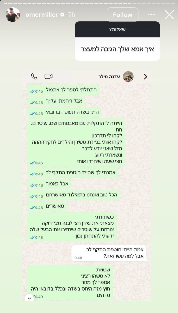 מילר התייחס לחוויה הלא נעימה ושיתף בפני עוקביו צילום מסך משיחה עם אמו שבה תיאר: "היינו בנמל התעופה בדובאי. הייתה לי התקלות עם מאבטחים שם. שוטרים. לקחו לי את הדרכון. לקחו אותי בניידת משירן והילדים לחקירה. מזל שאני יודע לדבר, נשארתי רגוע ותוך חצי שעה שחררו אותי. כשחזרתי מצאתי את שירן חצי לבנה-חצי ירוקה, צורחת על שוטרים שיחזירו את הבעל שלה. ידעתי להתחתן נכון".