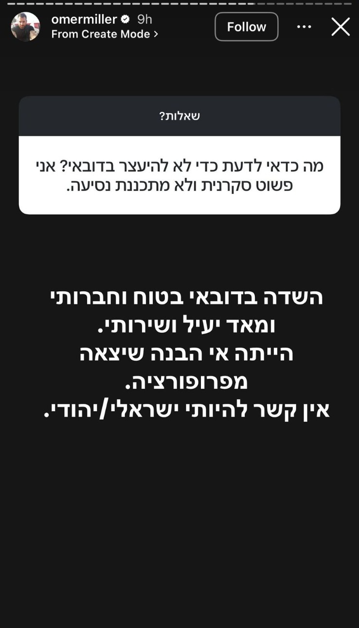 בתשובה לשאלת אחד העוקבים על הסיטואציה השיב: "השדה בדובאי בטוח וחברותי, יעל ושירותי. הייתה אי הבנה שיצאה מפרופורציה. אין קשר להיותי ישראלי או יהודי". שירן, אשתו, שיתפה בחשבון האינסטגרם שלה: "נלחצתי מאוד. מאוד. כמעט התעלפתי".
