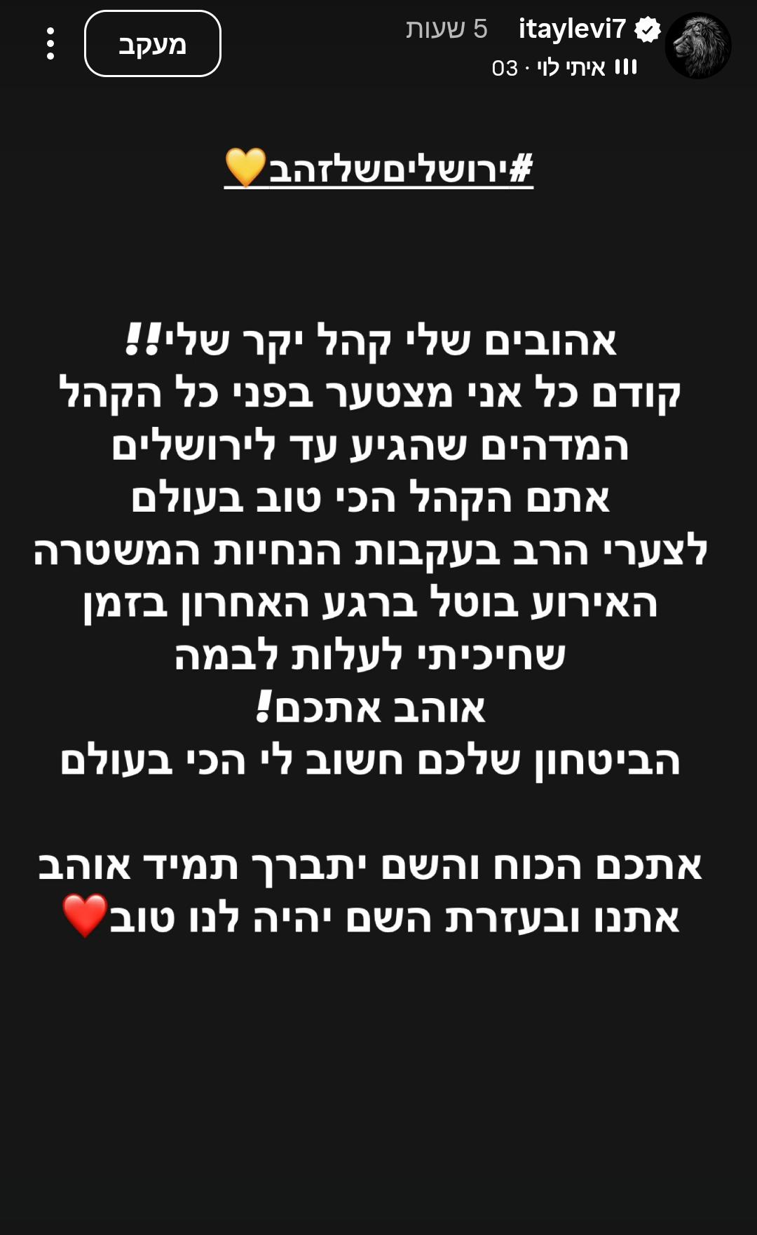 במהלך הלילה פרסמו קירל ולוי את התנצלותם לקהל שציפה להם: "אהובים שלי קהל יקר שלי!! קודם כל אני מצטער בפני כל הקהל המדהים שהגיע עד לירושלים, אתם הקהל הכי טוב בעולם", כתב לוי. לצערי הרב בעקבות הנחיות המשטרה האירוע בוטל ברגע האחרון בזמן שחיכיתי לעלות לבמה אוהב אתכם! הביטחון שלכם חשוב לי הכי בעולם אתכם הכוח והשם יתברך תמיד אוהב אותנו ובעזרת השם יהיה לנו טוב".