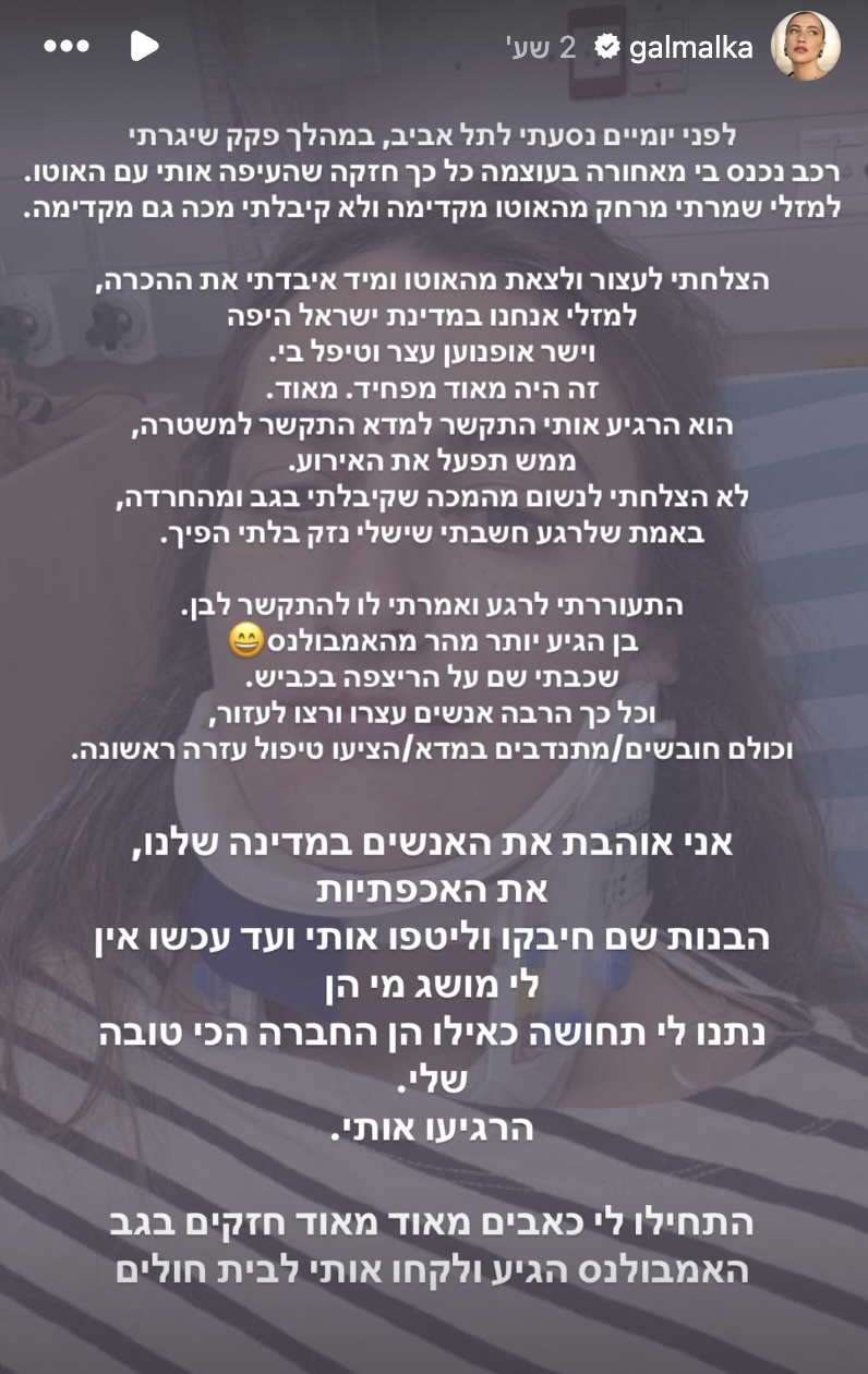 השחקנית גל מלכה שיתפה היום (חמישי) את עוקביה בתאונת דרכים שעברה לפני יומיים בדרכה לתל אביב.