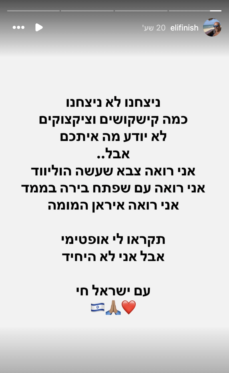 בסטורי המקורי, שגרר תגובות מעורבות, כתב פיניש: "ניצחנו לא ניצחנו, כמה קישקושים וציקצוקים. לא יודע מה איתכם אבל.. אני רואה צבא שעשה הוליווד, אני רואה עם שפתח בירה בממ"ד, אני רואה איראן הממומה. תקראו לי אופטימי אבל אני לא היחיד. עם ישראל חי".