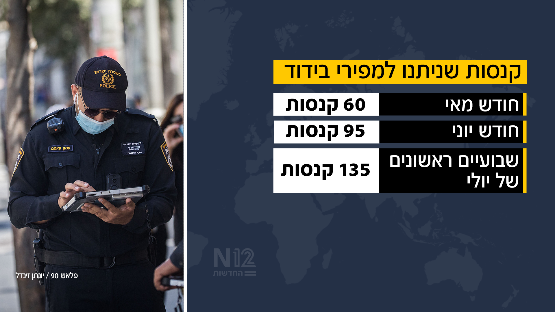 גורמים במערך האכיפה אמרו ל-N12 כי מספר הקנסות שניתנו למפרי בידוד בחודש מאי עמד על 60, בחודש יוני עלה המספר ל-95 ואילו במחצית חודש יולי בלבד ניתנו 135 קנסות למפרי בידוד שכאמור, חלקם חולים מאומתים או כאלה שבאו במגע עמם.
