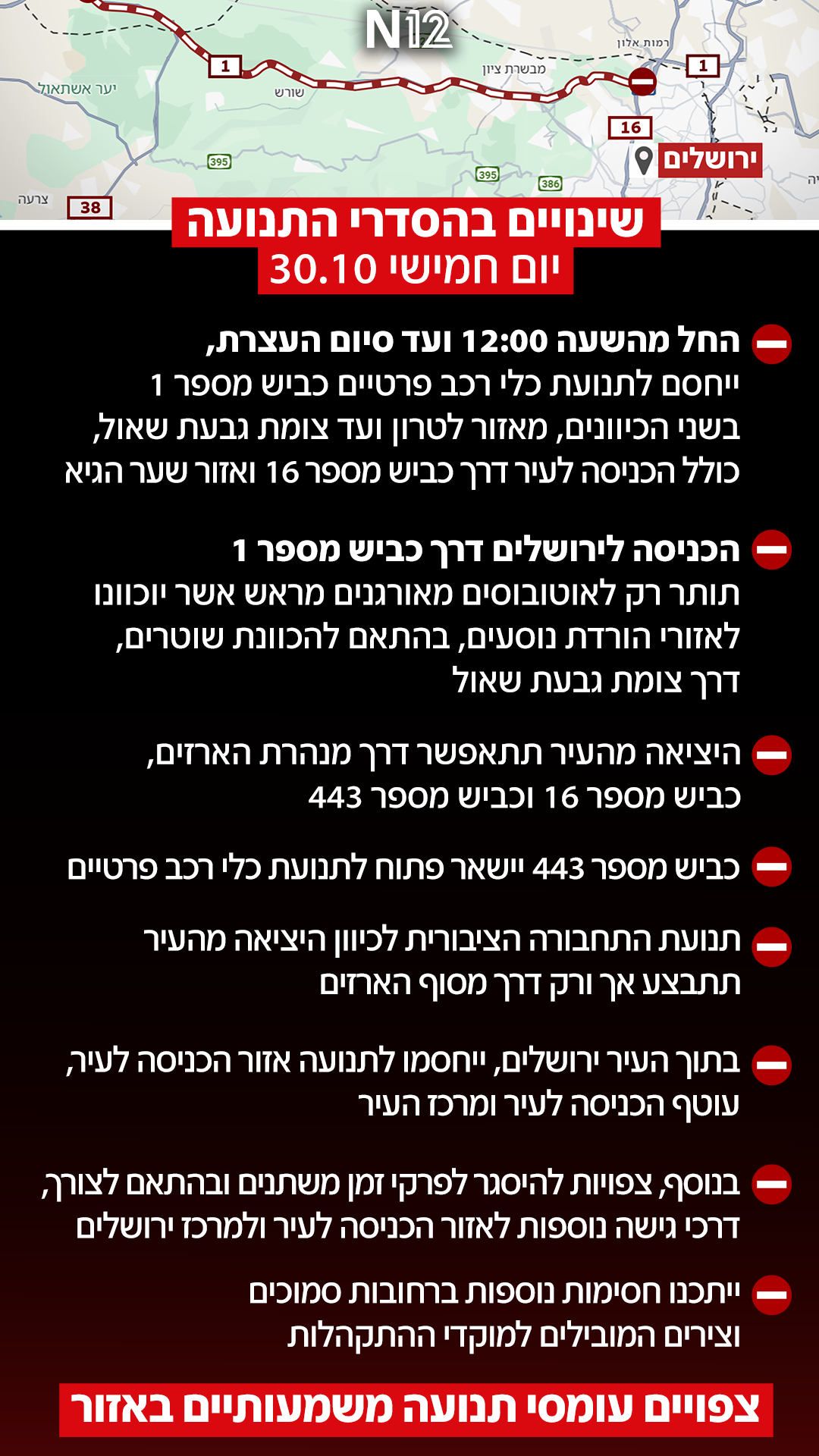 - החל משעה 12:00 ועד לסיום העצרת, ייחסם כביש 1 לתנועת כלי רכב פרטיים בשני הכיוונים - מאזור מחלף לטרון ועד צומת גבעת שאול.