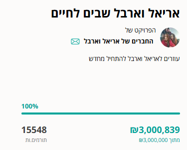 הראיון המטלטל של שורדי השבי ארבל יהוד ואריאל קוניו עם שי גל ב"אולפן שישי" אמש והפרסום במגזין סוף השבוע של N12 הביאו לשלל תגובות בארץ ובעולם. נכון להבוקר (שבת), בנוסף לתגובות החמות, הזוג שגדל יחד בניר עוז ונחטף ב-7 באוקטובר הצליח לגייס תרומות על סך יותר מ-2 וחצי מיליון שקלים בתוך 12 שעות באמצעות מימון המונים, עבור בניית בית. בסך הכול גייס הזוג 3 מיליון שקלים.