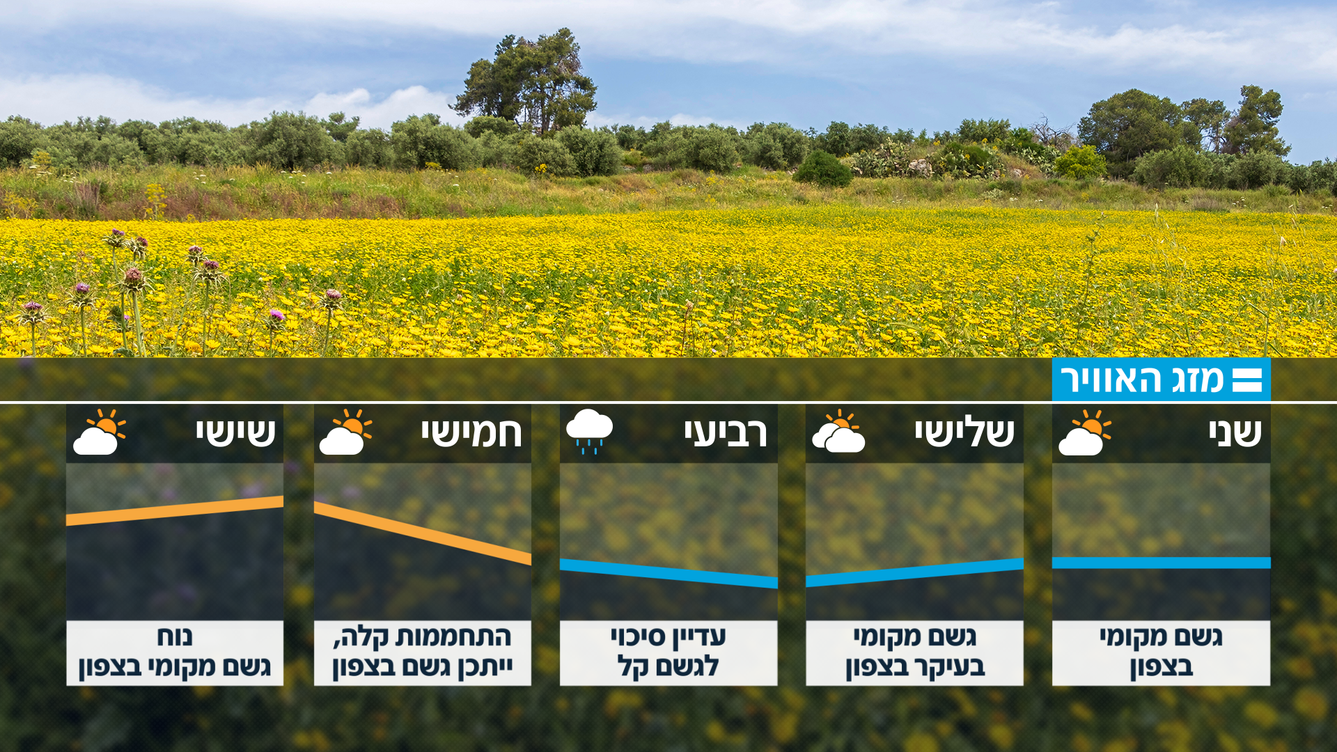 התחזית המלאה להמשך השבוע הטמפרטורות היום מוסיפות להיות נמוכות מהרגיל לעונה, כאשר גשם מקומי מלווה ברעמים וברקים צפוי להמשיך לרדת בצפון ובמישור החוף, וייתכן גם במרכז עד שעות הצוהריים המאוחרות. מחר יהיה מעונן חלקית עד מעונן וגשם ירד מדי פעם מהצפון ועד לצפון הנגב, תוך חשש מזרימות בנחלי ים המלח ומדבר יהודה.