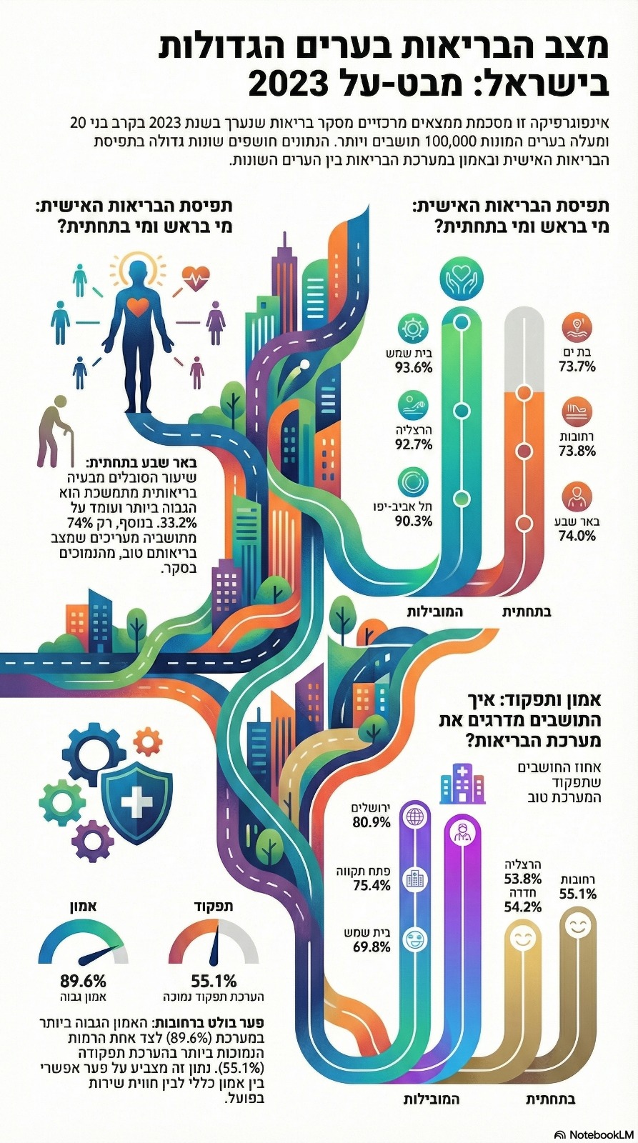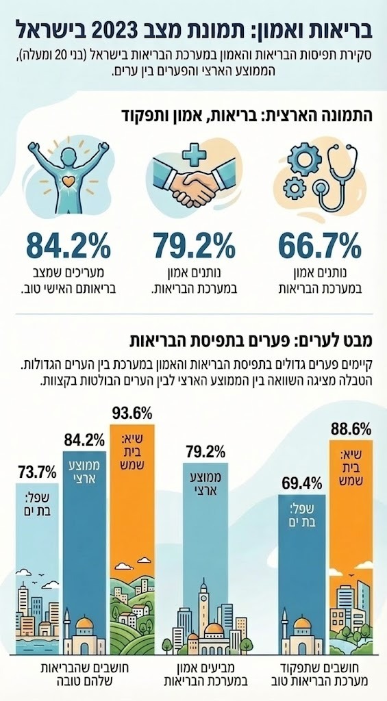 הנתונים על אמון במערכת הבריאות חושפים שכמה מהערים הבריאות יותר אינן בהכרח אלו שמאמינות במערכת. בתל אביב רק 59.5% מהתושבים סבורים שמערכת הבריאות מתפקדת היטב, למרות הערכת הבריאות הגבוהה בקרב התושבים. בירושלים הנתון גבוה בהרבה - 80.9% - ובחיפה ופתח תקווה האמון במערכת עומד על 87.5% ו־86.3% בהתאמה. העובדה שערים עם נתוני תחלואה גבוהים יחסית, כמו חיפה ונתניה, מציגות אמון גבוה במערכת, עשויה לרמז על שביעות רצון מהשירותים המקומיים גם אם התחלואה בפועל משמעותית.