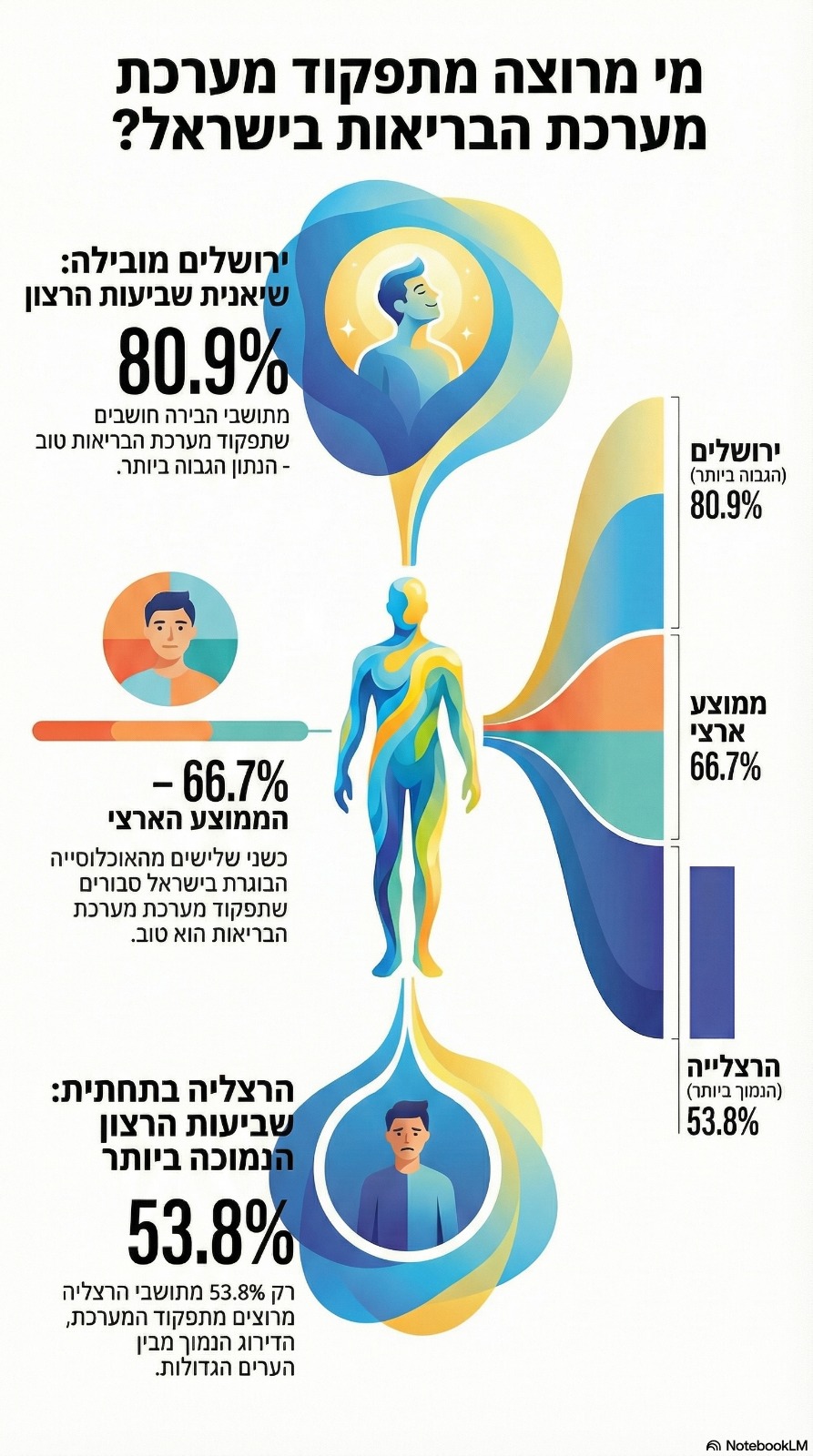 הלשכה המרכזית לסטטיסטיקה פרסמה את מדד שביעות הרצון של הציבור משירותי הבריאות בקהילה. המדד מבטא לא רק מצב רפואי, אלא גם רמת שירותים, נגישות לבריאות, מבנה גילאים ואיכות חיים כללית. לצד המדד הזה נבחנה תפיסת הבריאות העצמית של תושבים, האמון במערכת והערכת תפקודה. השילוב בין ארבעת המרכיבים יוצר תמונה רחבה יותר: לא רק מי “חולה יותר”, אלא איפה תושבים חיים בתוך מערכת שתומכת בהם או לא.