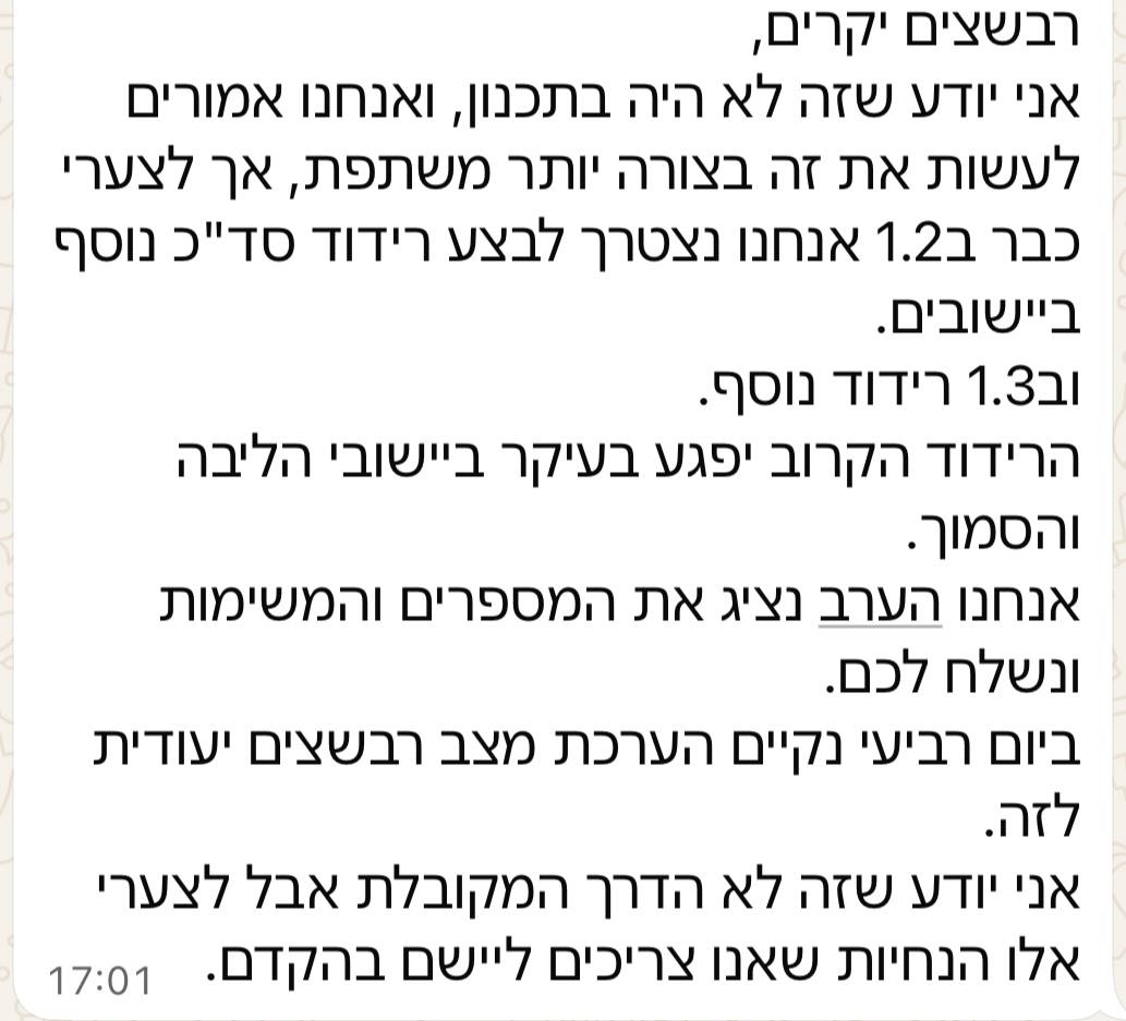 "הרידוד הקרוב יפגע בעיקר ביישובי הליבה והסמוך", נכתב בהודעה. "אנחנו הערב נציג את המספרים והמשימות ונשלח לכם. ביום רביעי נקיים הערכת מצב רבשצים יעודית לזה. אני יודע שזו לא הדרך המקובלת אבל לצערי אלו הנחיות שאנו צריכים ליישם בהקדם".