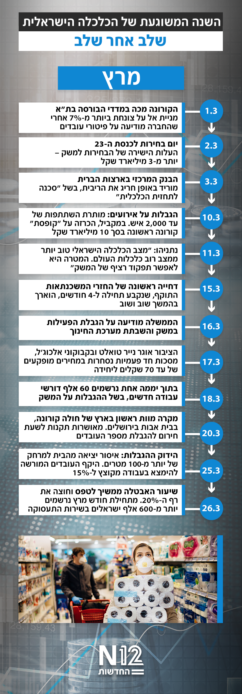 שנת 2020 הייתה רכבת הרים כלכלית: התחילה בירידה חדה – ומשם עברה ללופים של עליות ונפילות • סידרנו את כל הדרמות לתרשים זרימה: מהסגר הראשון והבהלה לנייר טואלט, דרך הקריאה של נתניהו לציבור לצאת "לעשות חיים" - ועד למיליון מובטלים והתפוגגותו של תקציב המדינה • פרויקט מיוחד ב-N12