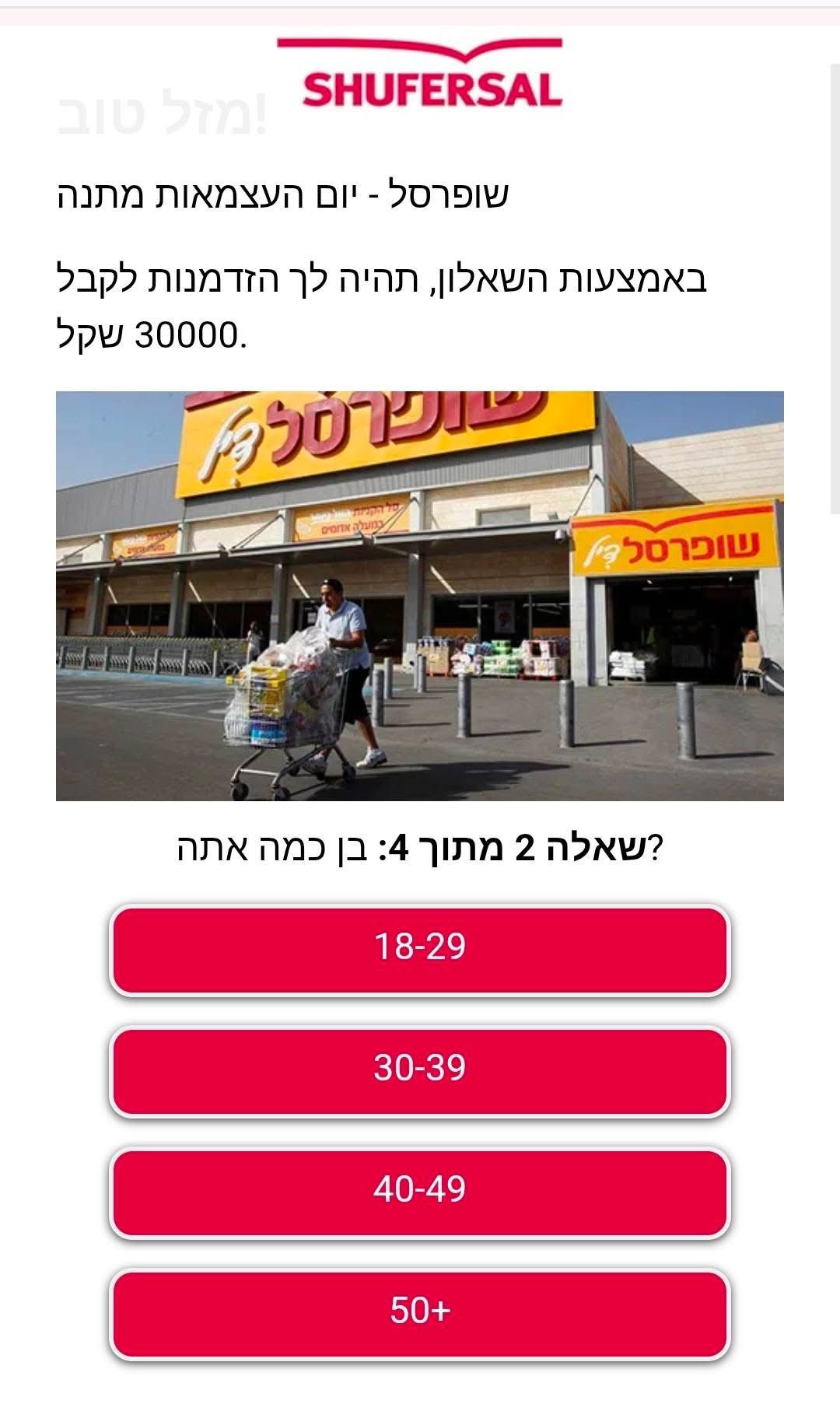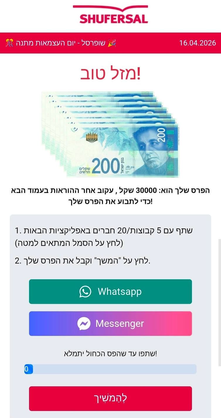 הקמפיין שמתחזה לשופרסל, שמופיע גם כמודעות ברשתות החברתיות וגם מופץ בוואטסאפ, מציע הזדמנות ל"זכייה" ב-30 אלף שקל לרגל יום העצמאות, דרך שאלון קצר של 4 שאלות.