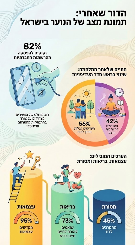 המחקר המקיף, שהוצג על ידי יניב וייצמן, בעלי חברת teenk, ובוצע בשיתוף IPANEL, חושף כי לאחר המלחמה 56% מהנוער מעדיפים לבלות מחוץ לבית ו-42% מעדיפים לחיות את הרגע מתוך חוסר ודאות לגבי העתיד. עוד עולה כי מדובר בדור שמקדש עצמאות (95%), שואף לאורח חיים בריא (73%) ומתחבר מחדש למסורת - עם 45% המדווחים על התקרבות לדת.