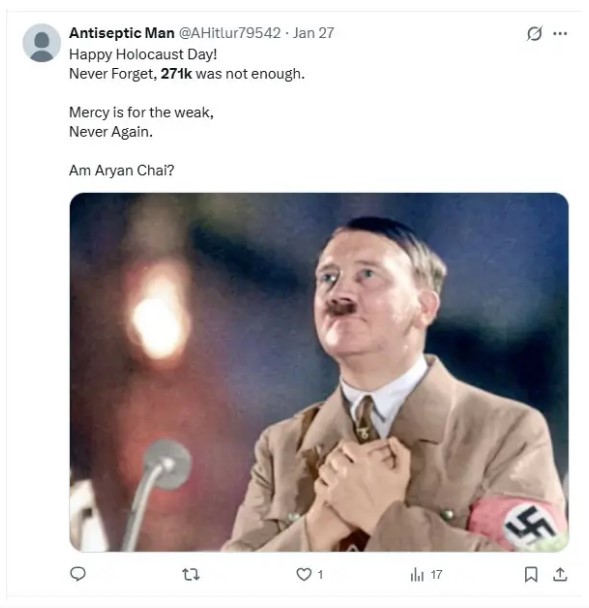 עוד תופעה היא תמיכה בהיטלר עם האשטגים כמו "היטלר צדק" או "6 מיליון זה לא מספיק". "זה לא חדש, אבל זה קורה יותר ויותר, וזה מאוד פופולרי בעקבות השינויים ב-X", מציין אלדובי. "מטא וטיקטוק פועלות בצורה די יפה להסיר תכנים כאלה. ב-X זה גם קורה אחרי הרבה מאמצים, אבל כל כך קל לפתוח שם בוט או יוזר אנונימי".