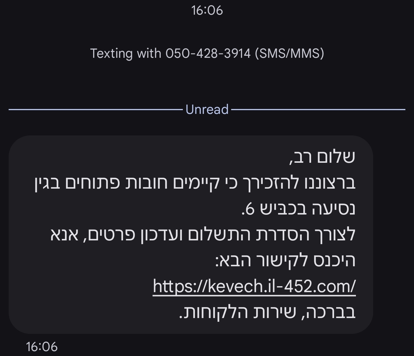 - אם יש ספק לגבי מקור ההודעה, אין ללחוץ על לינקים שמופיעים בה. במקום זה, מומלץ להיכנס לאתר הרשמי של השולח (למשל: דואר ישראל, בנק לאומי או כביש 6), להתחבר לאזור האישי ולבדוק אם ההודעה מופיעה שם.