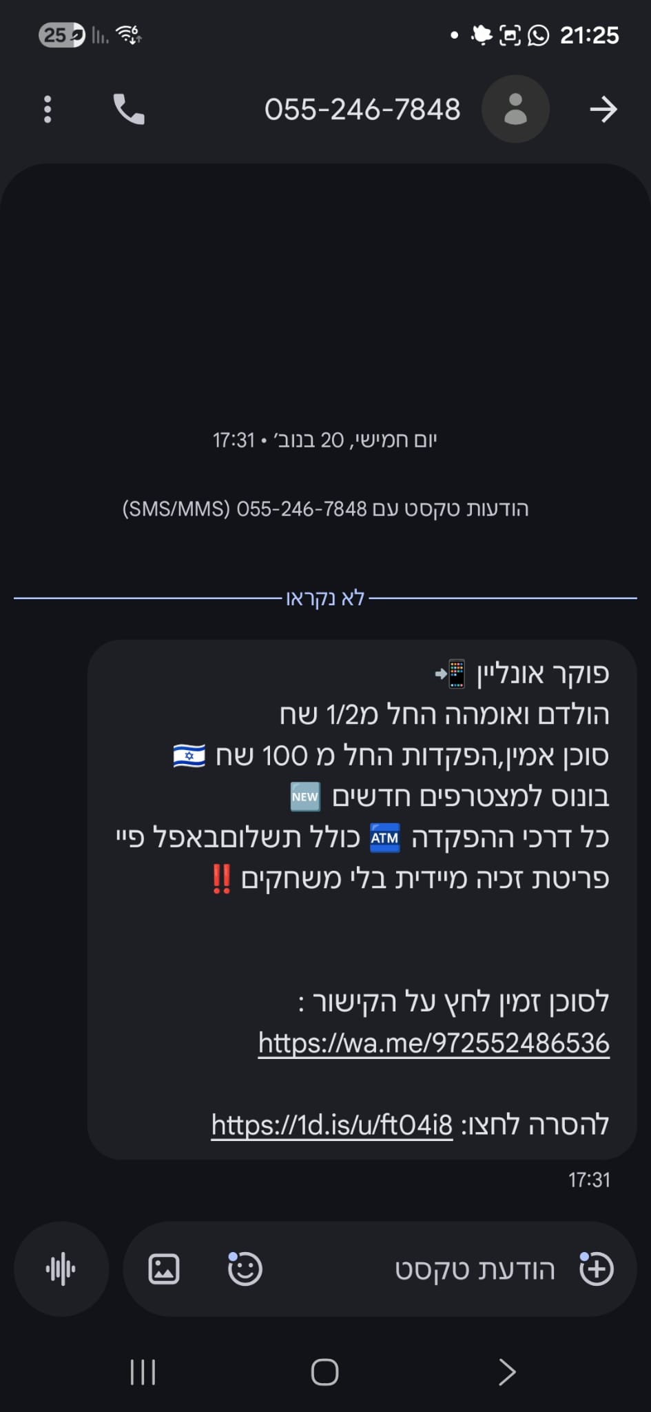 - הודעה שמגיעה מקידומת של אחת מחברות הסלולר הווירטואליות.