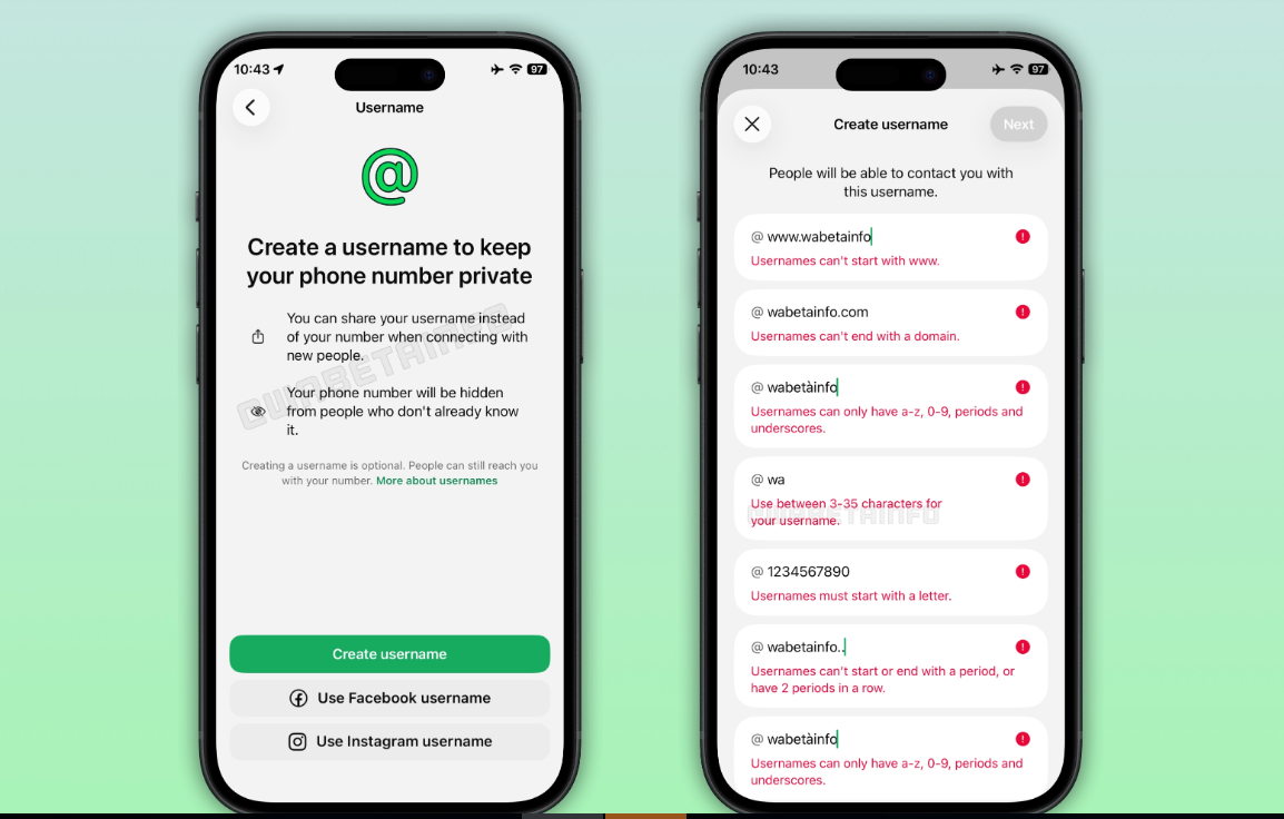 וואטסאפ גם קבעה כללים ברורים לבחירת שם משתמש: הוא חייב לכלול לפחות אות אחת, להיות באורך של 3 עד 35 תווים, ולא לכלול סיומות כמו .com או להתחיל ב-www, כדי שאנשים לא יחשבו בטעות שהם מתקשרים עם אתר רשמי. בנוסף, ניתן להשתמש רק באותיות קטנות, מספרים, נקודות וקווים תחתונים.