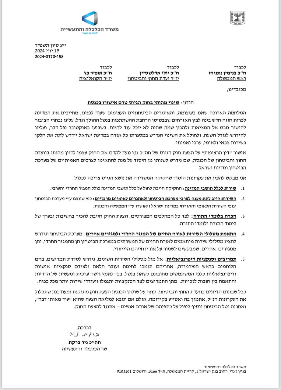 המרד בליכוד עולה שלב: שר הכלכלה ניר ברקת שיגר היום (רביעי) מכתב לראש הממשלה נתניהו ובו הבהיר כי יתנגד לחוק הפטור מגיוס "יחד עם חברי כנסת נוספים מהליכוד". במקביל, ראש הממשלה נתניהו שיגר מסר לחברי הקואליציה, בסרטון שפרסם פחות משעה לאחר הודעת ברקת: "תתאפסו. תתעלו לגודל השעה". מטעם הליכוד נמסר גם: "מצופה מניר ברקת לטפל ביוקר המחייה ולא לחפש תירוצים להפיל ממשלת ימין בזמן מלחמה".