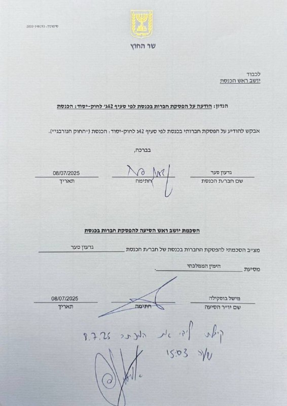 גדעון סער התפטר מהכנסת במסגרת החוק הנורווגי
