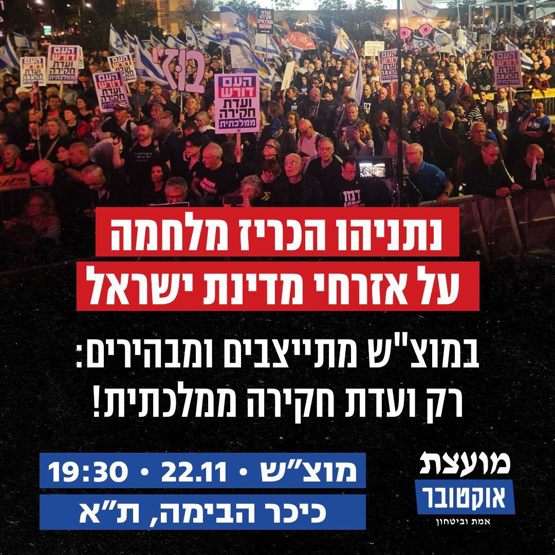 כאמור, במוצאי השבת תקיים מועצת אוקטובר מחאה בכיכר הבימה שבה יקראו להקמת ועדת חקירה ממלכתית. כל ראשי האופוזיציה הציונית המתנגדים לנתניהו הודיעו כי ישתתפו, אולם בקרב חברי הקואליציה לא נשמעה הודעה דומה. "אנחנו מזמינים את כל ראשי הקואליציה לבוא ולעמוד בחזית אחת עם כל עם ישראל. אני מאוד מעריך את ההיענות של ראשי האופוזיציה. מימין ומשמאל, מכל הקשת, באים ועומדים איתנו, עם המשפחות השכולות ועם כל עם ישראל בדרישה הברורה להקים ועדת חקירה ממלכתית. אני קורא לראשי הקואליציה ולחברי כנסת מהקואליציה ולשרי הממשלה לבוא ולעמוד איתנו ובאמת לנסות לנסות ולבנות לעצמם איזשהו עמוד שדרה אידאולוגי ציוני-אמיתי ולא להמשיך ולהיות אסקופה נדרסת שמוכרים את הערכים שלהם ולהתנהג כמו דגים מתים. רק דגים מתים שוחים עם הזרם".