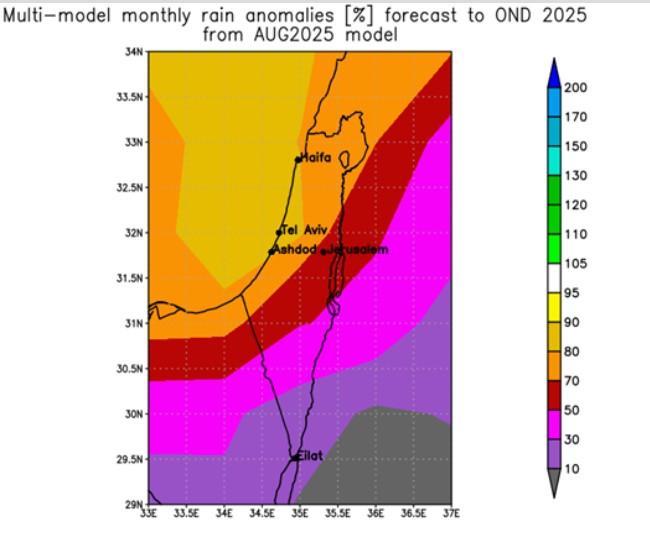 באזור צפון הארץ והמרכז כמויות הגשם ינועו סביב ה-70%-80% ובאזור דרום הארץ סביב 50%-70% בלבד. הטמפרטורות בתקופה מחודש ספטמבר עד נובמבר 2025 צפויות להיות גבוהות בכ-0.5 מעלה ביחס לממוצע הרב-שנתי.