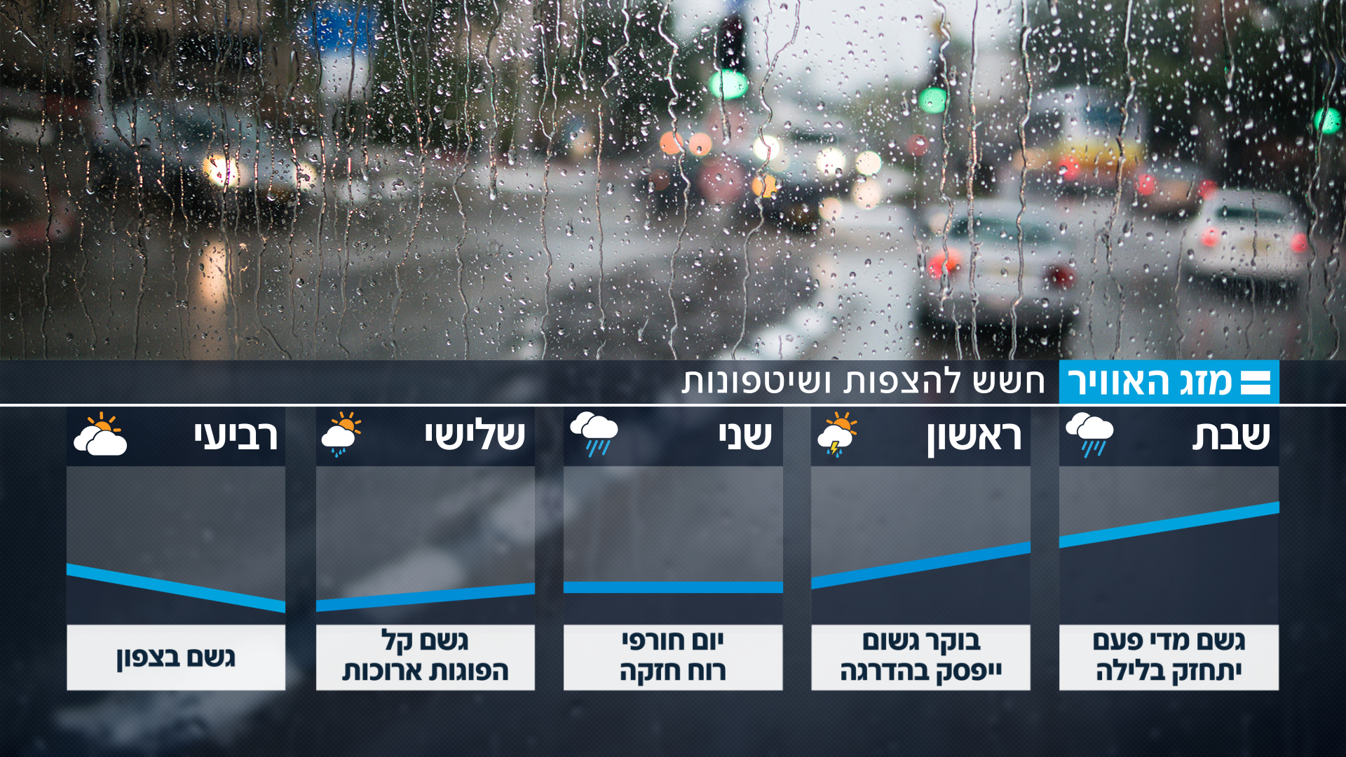 שבת חורפית: הערב (בין שישי לשבת) יחלו בהדרגה גשמים מקומיים בצפון ובמרכז, שיתחזקו לאורך הלילה. מחר תורגש ירידה בטמפרטורות, גשמים בהפוגות צפויים תחילה בצפון ובמרכז והחל משעות הצהריים גם במרחב הנגב. לכל אורך היום קיים פוטנציאל לגשם נוסף ושלג בחרמון. אזהרת הצפות מקומיות בערי החוף וגם אזהרת שיטפונות בנחלים: נחלי מדבר יהודה, ים המלח, הערב והנגב.