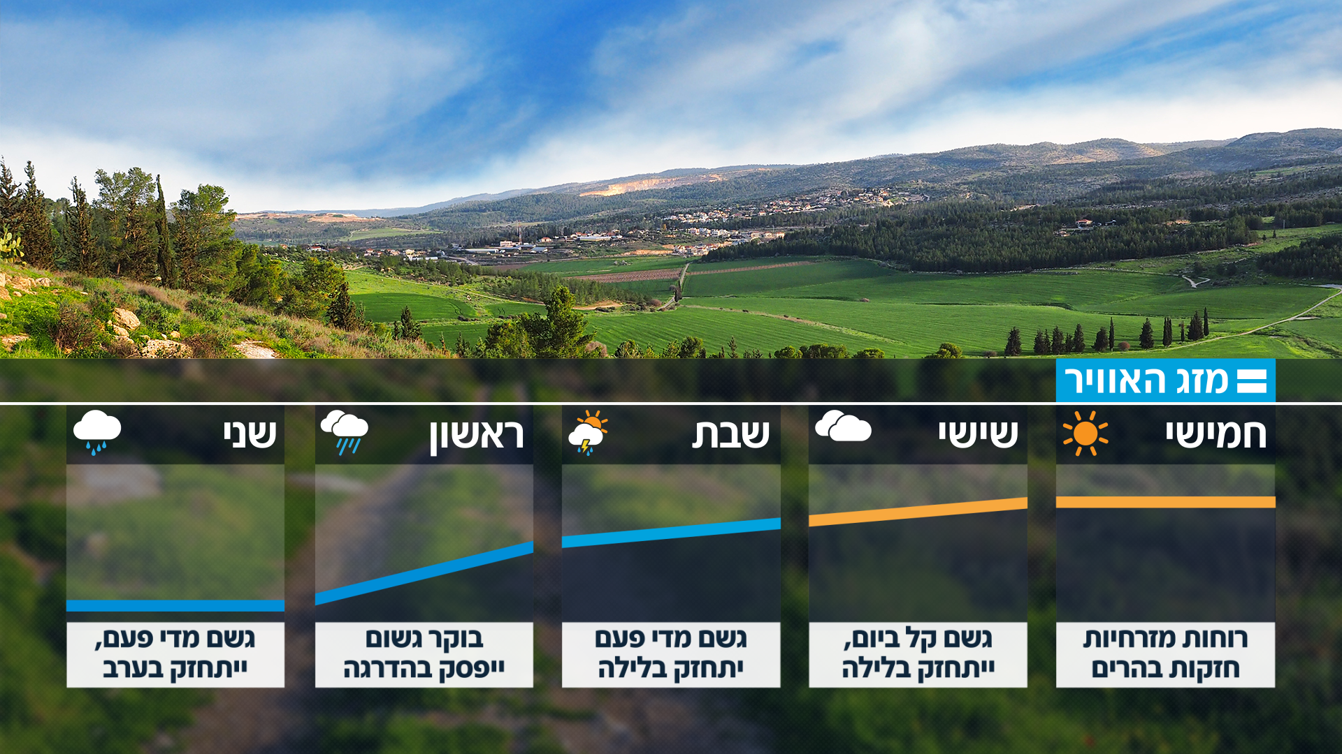 מזג האוויר היום יהיה נוח, עם רוחות מזרחיות בהרי הצפון והמרכז • מיום שישי תחול ירידה בטמפרטורות ויחלו גשמים בצפון ובמרכז, שיתחזקו במהלך הלילה • בשבת צפוי מזג אוויר חורפי עם חשש לשיטפונות וסיכוי לשלג בחרמון