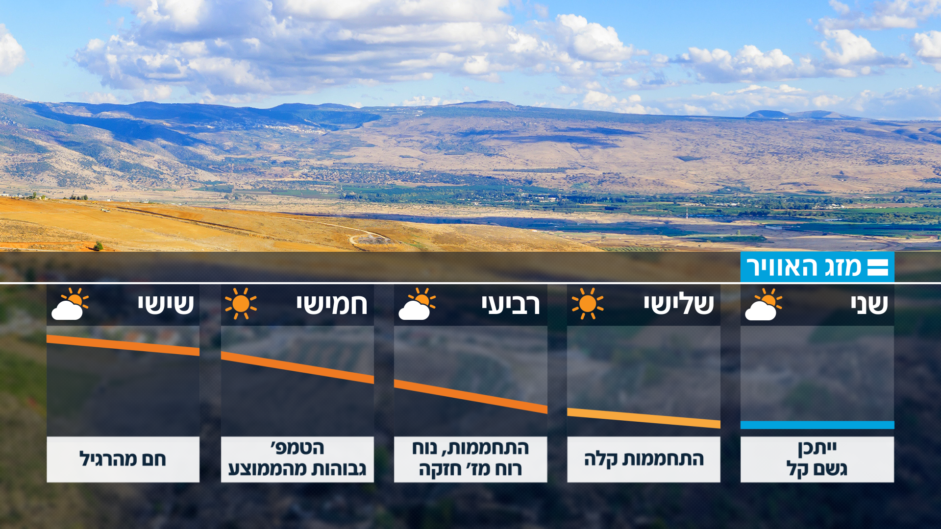 בהמשך השבוע הטמפרטורות יעלו ויישארו גבוהות לעונה גם במהלך סוף השבוע. בשבת כבר נתחיל להרגיש ירידה בטמפרטורות לקראת גשם שיגיע במוצאי השבת תחילה באילת, ובהמשך צפוי להגיע לאזורים נוספים בארץ.