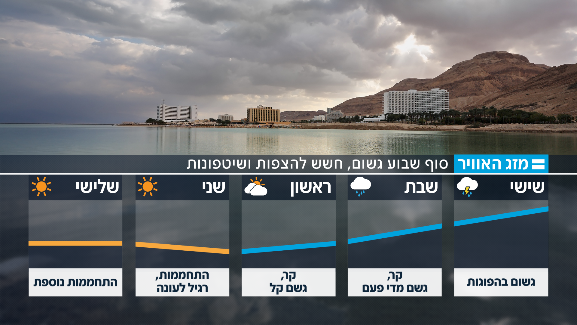 סוף שבוע חורפי: היום (שישי) תורגש ירידה בטמפרטורות וגשם ירד בהפוגות בצפון, במרכז, ובהמשך היום גם בדרום. לאורך מישור החוף ייתכנו הצפות, ויש חשש לשיטפונות בנחלי הנגב, הבקעה, הערבה, ים המלח ומדבר יהודה. האזהרה תקפה גם למחר. בנוסף, קיים סיכוי לשלג ראשון שירד בחרמון.