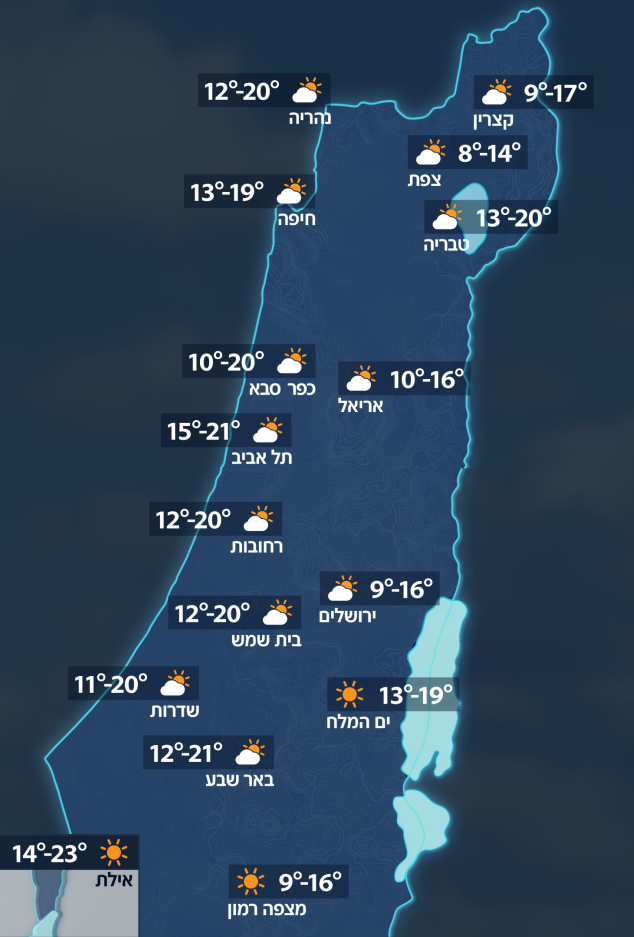 מחר, בשבת, מזג האוויר יהיה קר וחורפי. גשם צפוי לרדת לפרקים בצפון ובמרכז כבר משעות הבוקר, ובהמשך היום גם בצפון הנגב. בנוסף, קיים סיכוי לשלג בחרמון. חשש להצפות בערי החוף ואזהרת שיטפונות לנחלי מדבר יהודה, ים המלח והנגב. בשעות הערב צפויה התחזקות נוספת של הגשם, שיהיה סוער לפרקים.