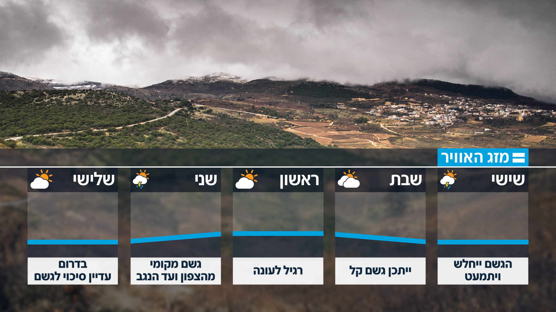 בשבת צפוי מזג אוויר נוח, אך ייתכנו גשמים קלים וחולפים בעיקר לאורך החוף ובנגב. ביום שני הגשם צפוי לחזור לזמן קצר, עם מערכת מקומית שתלווה אותנו ליום אחד בלבד.