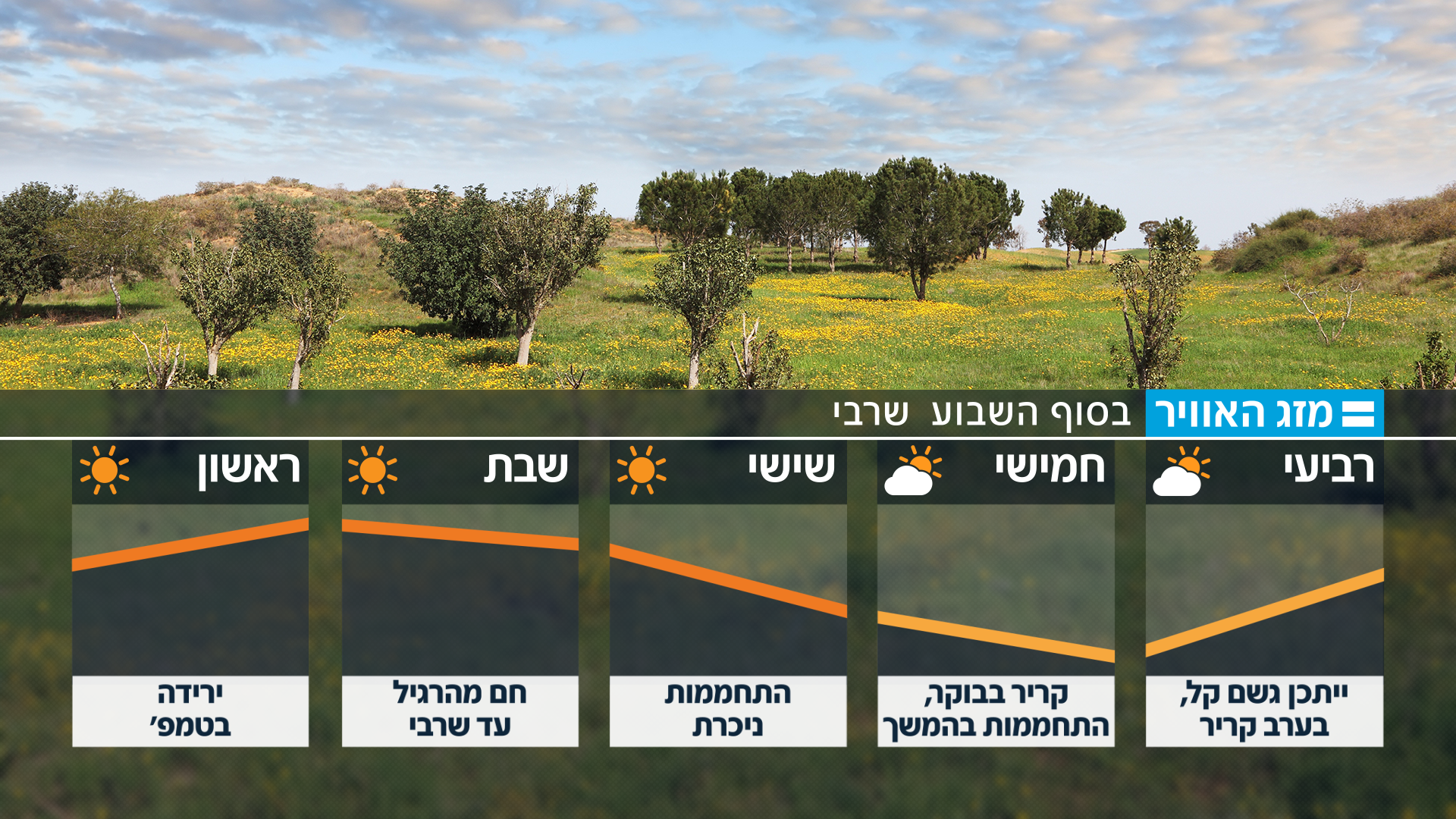 הטמפרטורות היום יהיו רגילות לעונה עם עומס חום קל עד בינוני • בשעות הערב, עם כניסת הצום, מזג האוויר צפוי להיות נוח • מחר תחול עלייה בטמפרטורות, אך הן צפויות להיות רגילות לעונה גם כן • השינוי המורגש יותר במזג האוויר יגיע החל מיום שישי, עם התחממות ניכרת ושרב שיורגש בעיקר בפנים הארץ • הקלה צפויה בתחילת השבוע הבא