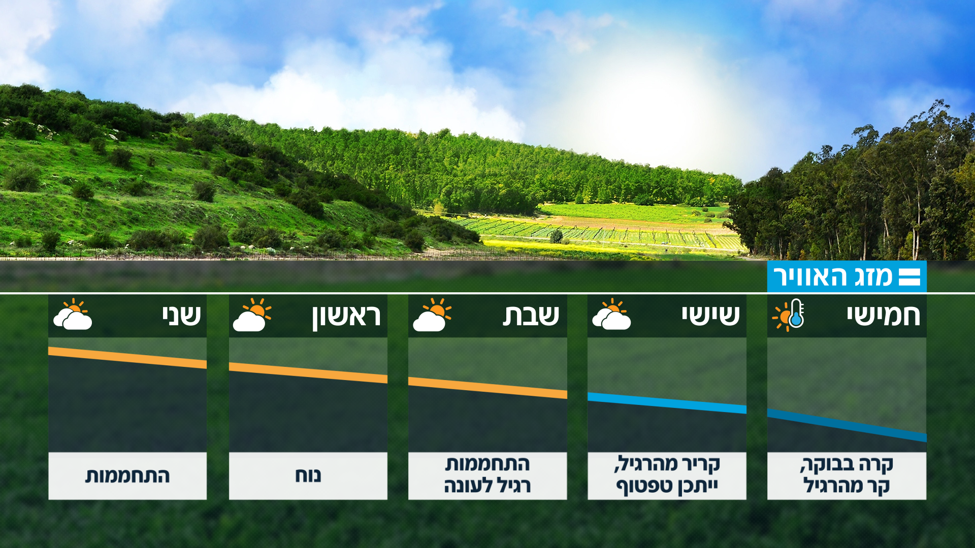 הטמפ' היום יישארו נמוכות, והשמיים יהיו בהירים - לא צפוי לרדת גשם • מחר תורגש עלייה קלה בטמפ', לצד טפטופים, בעיקר בצפון הארץ • בשבת מזג האוויר יהיה נוח • התחזית לסוף השבוע הקרוב