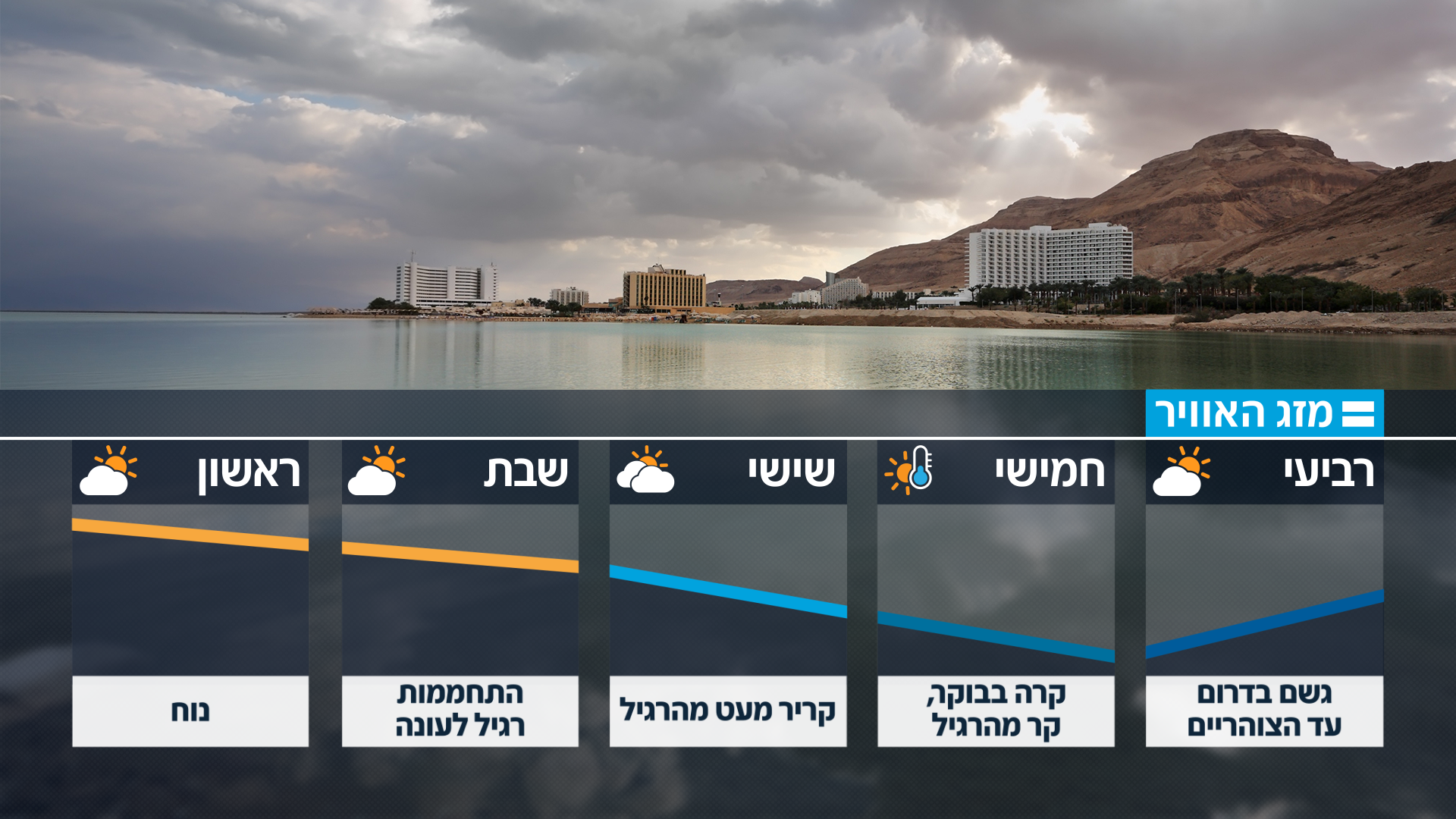 הלילה ועד מחר יהיה גשום, עם סיכוי לשיטפונות בנחלי ים המלח, מדבר יהודה, הנגב והערבה • החל מהשעה 22:00, ייחסם לתנועה כביש 40 • מחר צפוי להיות היום הכי קר שהיה לנו עד כה החורף • בסוף שבוע - מזג אוויר צפוי להיות נוח ומתאים לטיולים