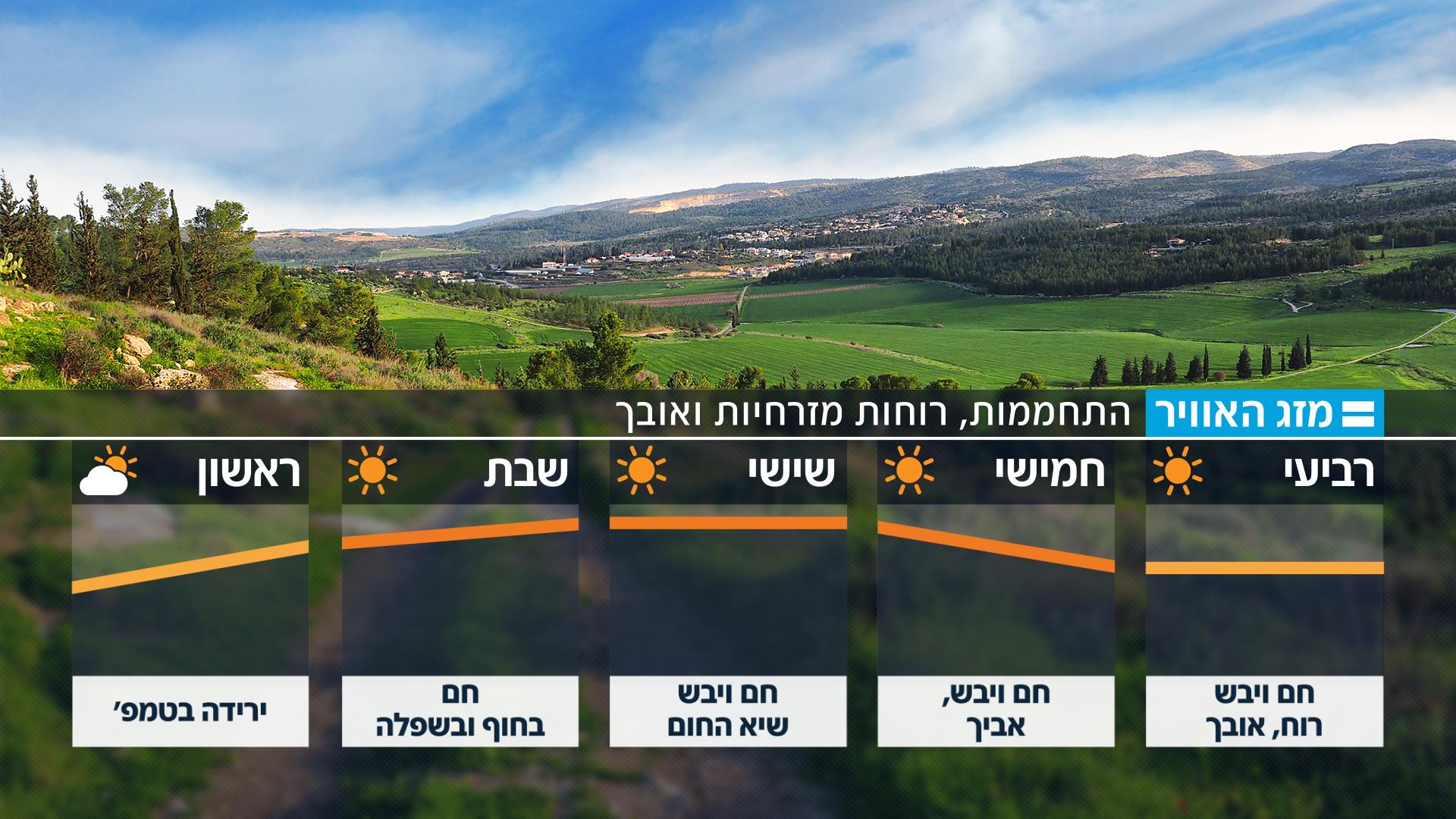 מזג האוויר ממשיך להיות חם מהרגיל - והגשם לא נראה באופק • קיים סיכוי לאובך באזורי המרכז והצפון ורוחות חזקות יינשבו בהרים • מגמת ההתחממות תימשך בימים הקרובים, כשהשיא יגיע ביום שישי • בשבת תחול ירידה קלה בטמפרטורות - אך מזג האוויר ימשיך להיות חם ויבש מהרגיל לעונה